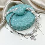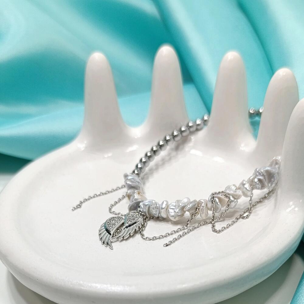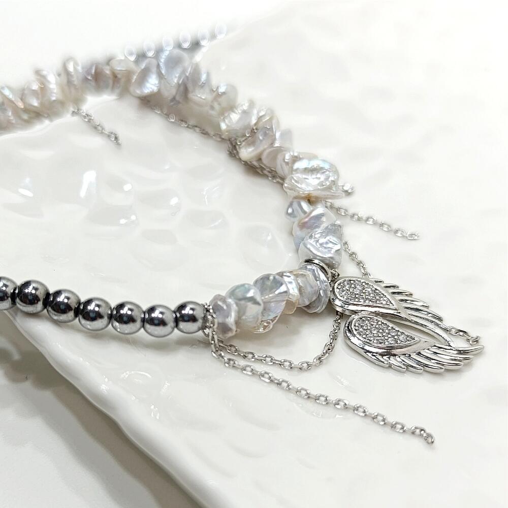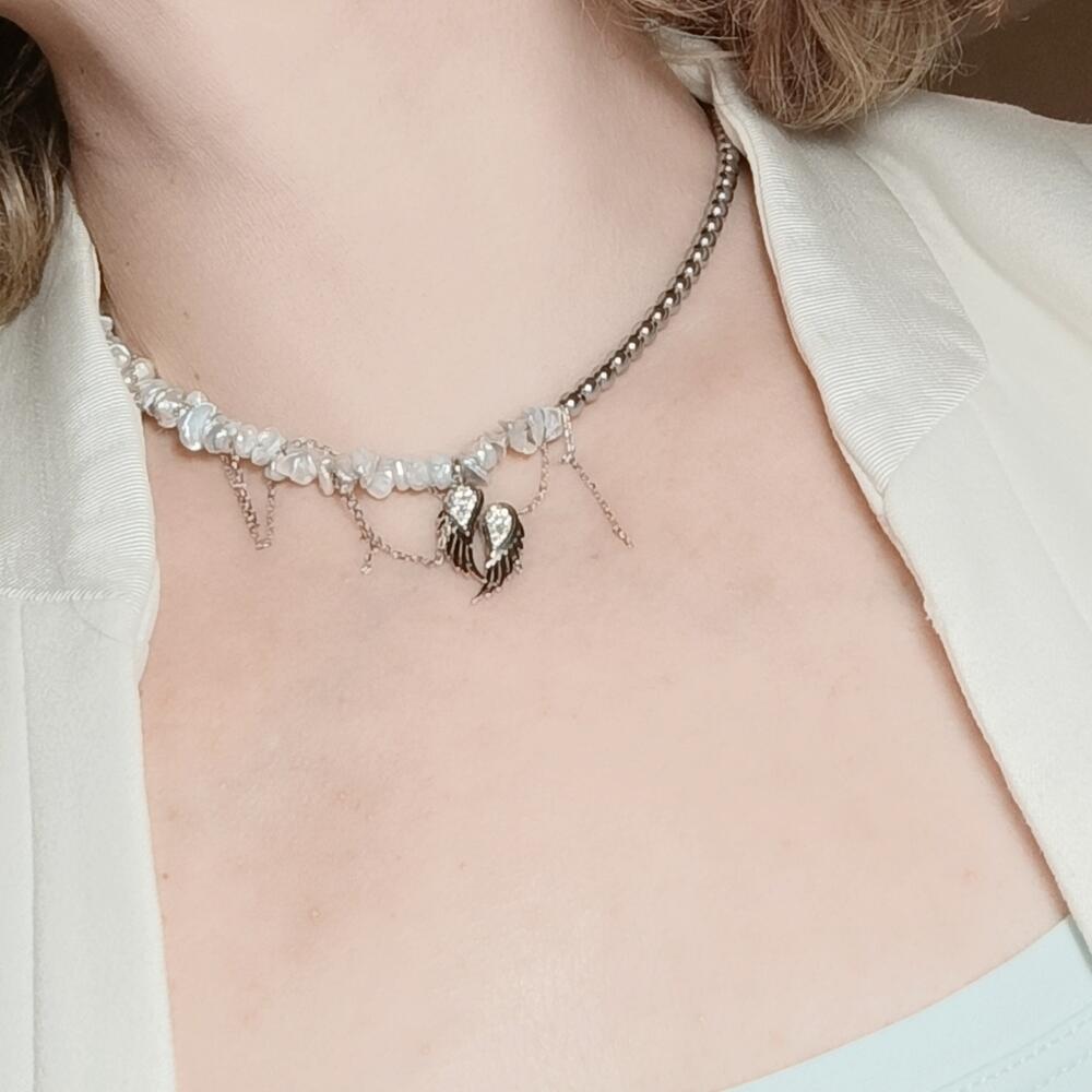 Асимметричное колье из натурального жемчуга ракушка с подвеской крылья ангела и цепочками. Хороший подарок девушке