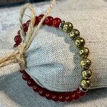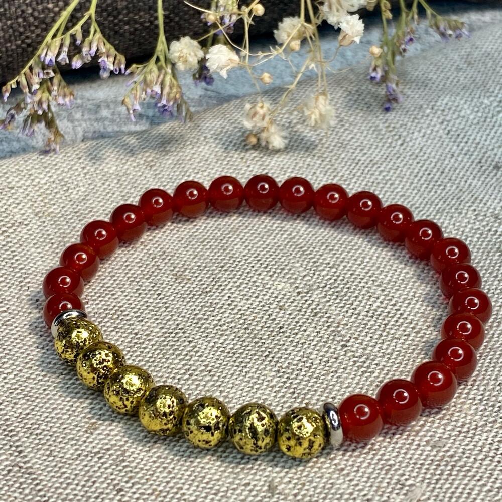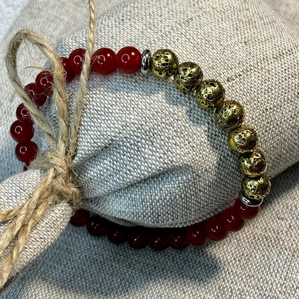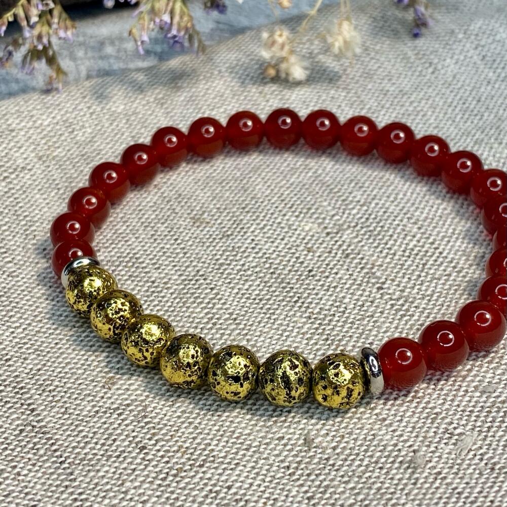 Браслет из красного агата с вулканической лавой с золотым покрытием. Подойдёт на запястье 14-15 см. Доставим в подарочном льняном мешочке.