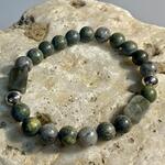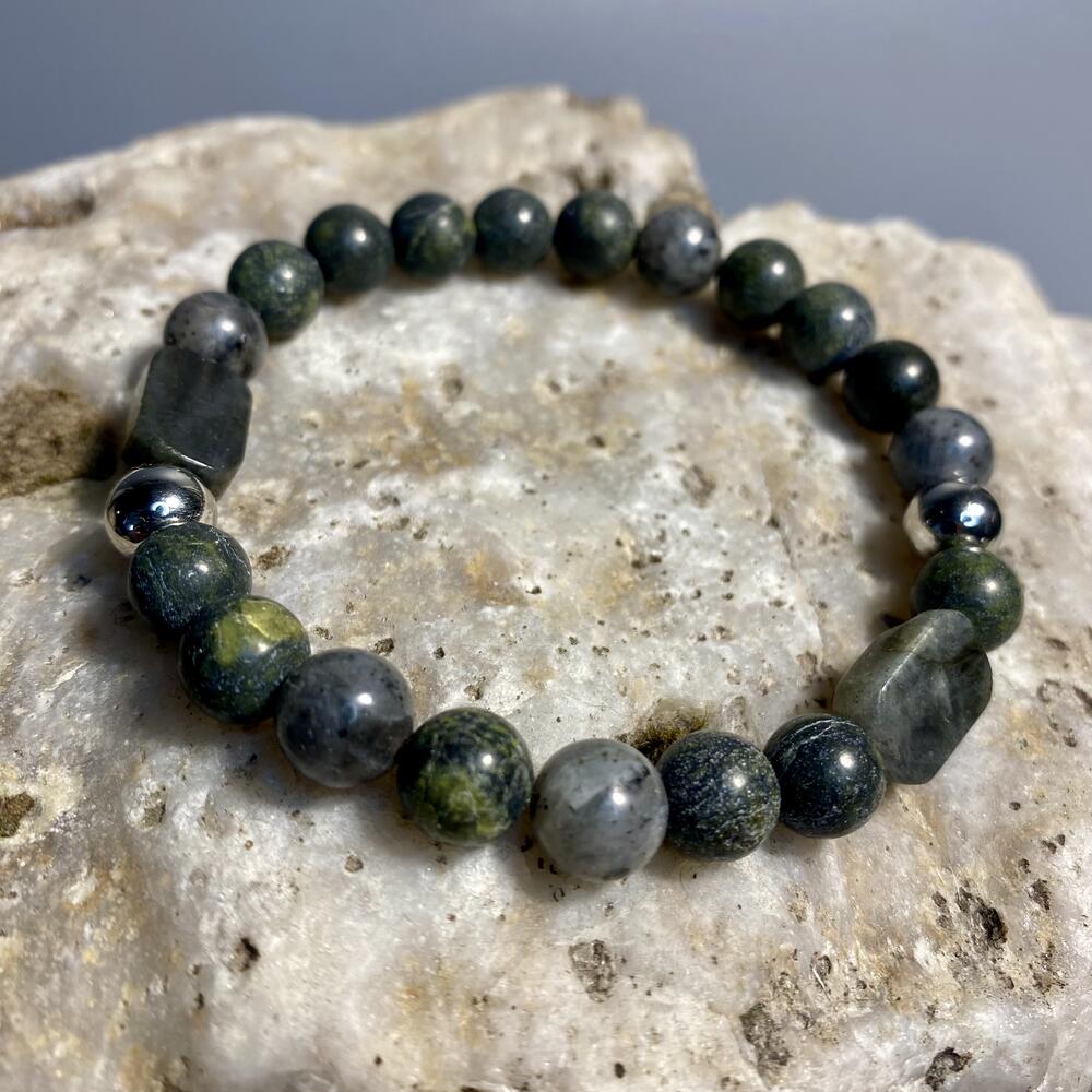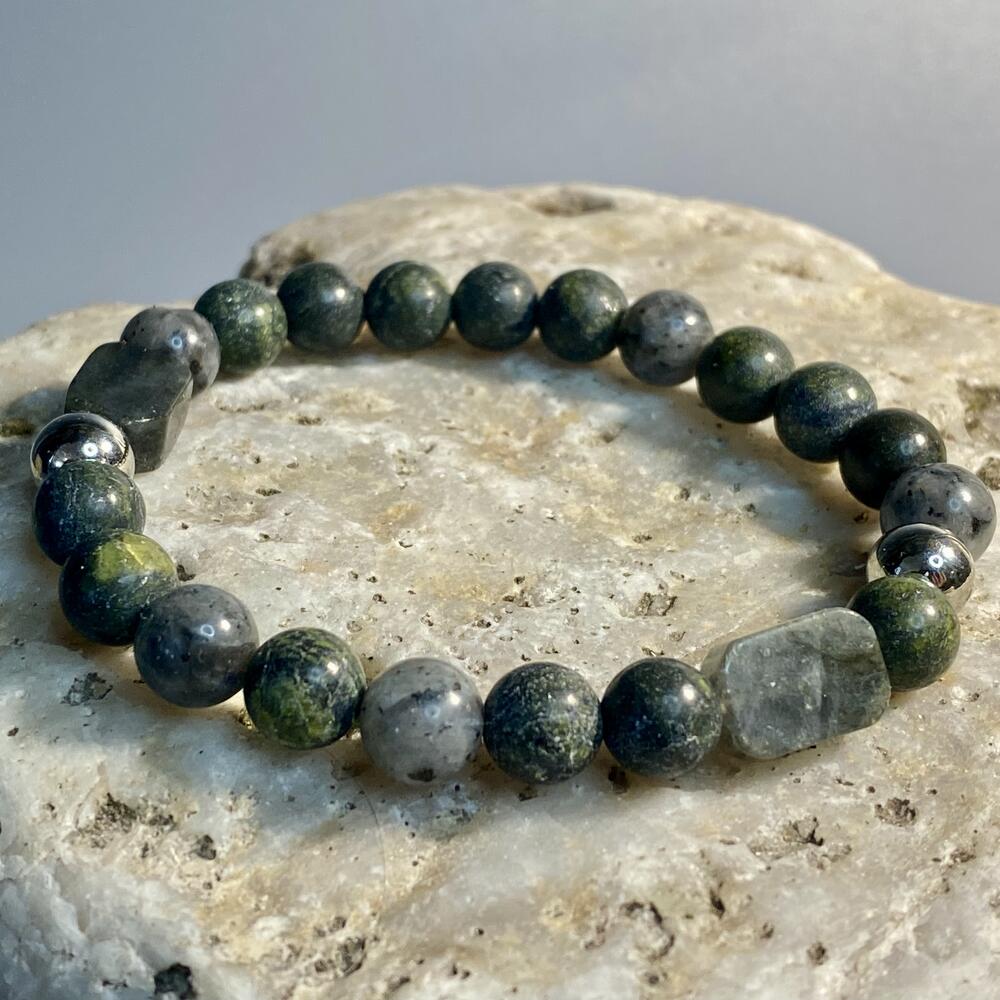 Этот изысканный браслет сочетает глубокую зелень яшмы, графитовые переливы лаврикита и мистическое сияние лабрадорита, дополненные сияющими вставками из нержавеющей стали. Он станет стильным акцентом и вашим личным талисманом силы и спокойствия. Символика камней: Зеленая яшма – камень стабильности и жизненной энергии; заземляет, гармонизирует и поддерживает сердце. Лаврикит – защитник от перегруза и чужих эмоций; помогает сохранять ясность ума и укрепляет личные границы. Лабрадорит – минерал трансформации и интуиции; раскрывает потенциал, усиливает уверенность и оберегает от негатива. Нержавеющая сталь – гипоаллергенный металл, не темнеет и добавляет благородный блеск. Почему стоит выбрать этот браслет? ✔ Натуральные камни с выраженной энергетикой и благородной текстурой. ✔ Элегантный дизайн, который легко впишется в любой гардероб. ✔ Комфортная посадка – эластичная основа подходит для запястий 16–17 см. ✔ Универсальность – хорош в повседневных и вечерних образах; уместен в стиле унисекс. Добавьте этот браслет в свою коллекцию и позвольте ему приносить вам внутреннее равновесие, ясность и силу каждый день! 💚 Доставим в подарочном льняном мешочке.