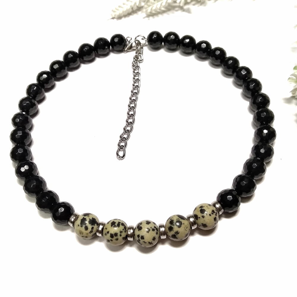 Чокер с чёрным агатом и яшмой далматина: украшение, которое говорит за вас Представьте аксессуар, в котором слились сила природы и современный дизайн. Чокер с гранёным чёрным агатом и яшмой далматина — это не просто украшение. Это ваш персональный талисман, элегантный штрих к любому образу и молчаливый рассказчик о вашем вкусе. Игра контрастов. Глубокий, мистический чёрный агат и игривая пятнистая яшма создают завораживающий дуэт. Как ночь и утренний туман, как скала и морская пена — в этом сочетании есть своя поэтика. Гранёный агат ловит каждый луч света, рассыпая крошечные блики. Яшма отвечает мягким, тёплым сиянием. Вместе они создают динамичный визуальный ритм. Мемори‑основа словно создана для вас: чокер мягко обхватывает шею, не сдавливая, но и не сползая. Надеваете — и сразу чувствуете: «это моё». Он дарит владельцу - Уверенность. Чёрный агат — камень-защитник. Он словно шепчет: «Ты в безопасности. Действуй». Лёгкость. Яшма далматина добавляет нотку беззаботности, напоминая: даже в серьёзности есть место радости. Внимание без слов. Этот чокер не кричит — он интригует. Взгляд невольно задерживается на игре камней, на изящной линии шеи, на балансе строгости и игривости.
