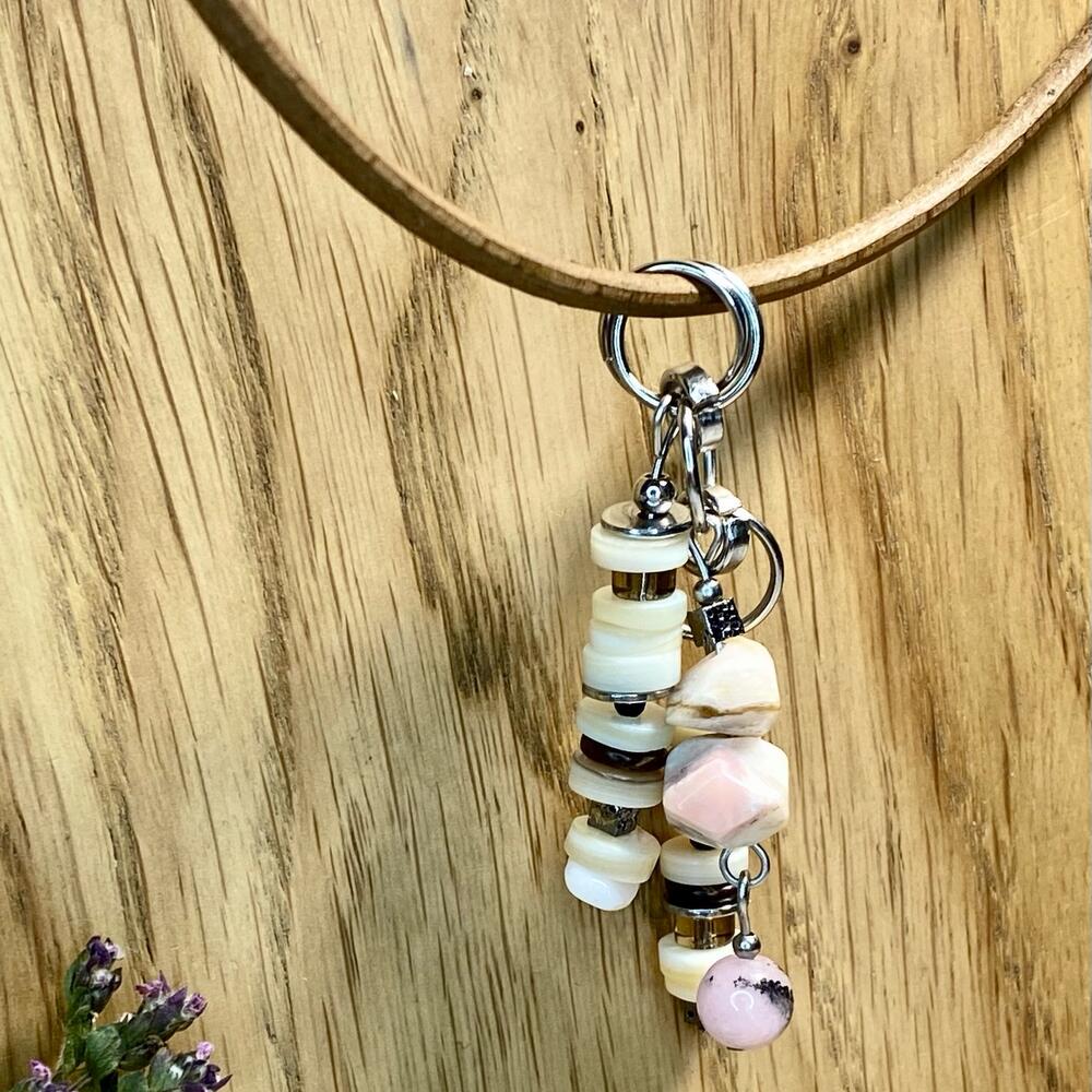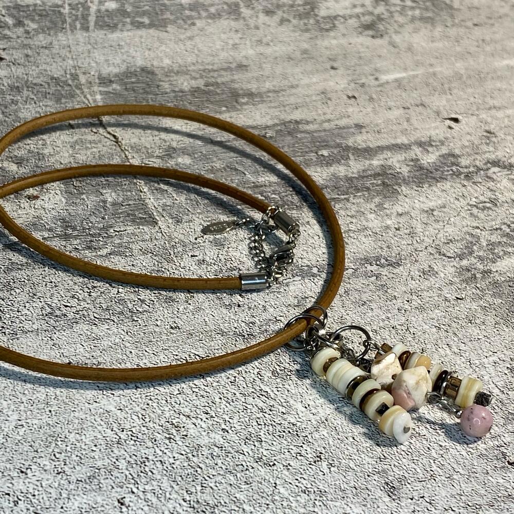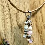Подвеска с перламутровыми бусинами, розовым опалом и фурнитурой из нержавеющей стали. Шнурок из натуральной кожи. Доставим в подарочном мешочке из льна.