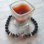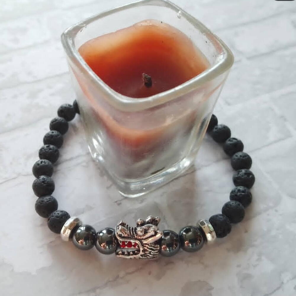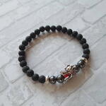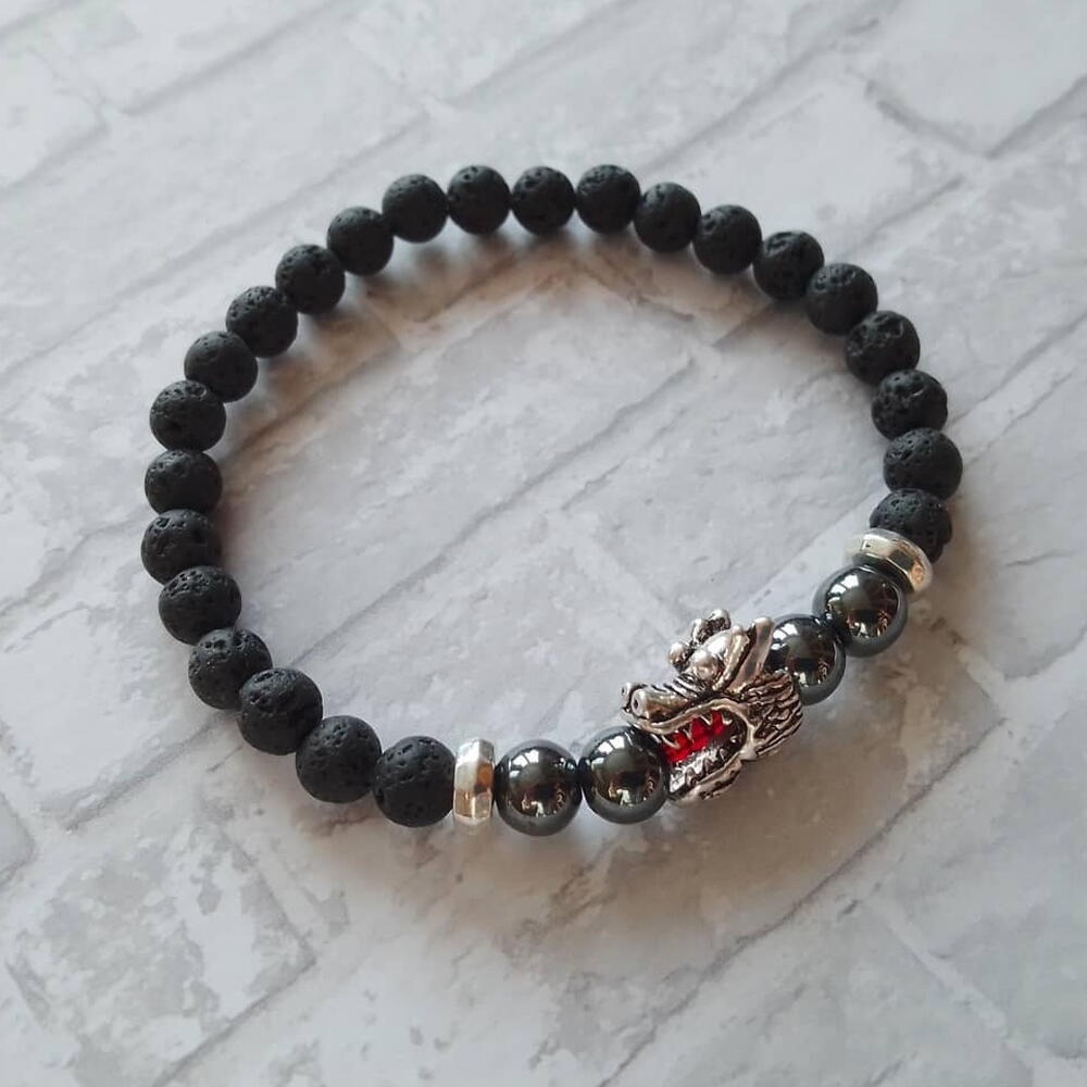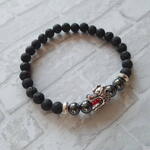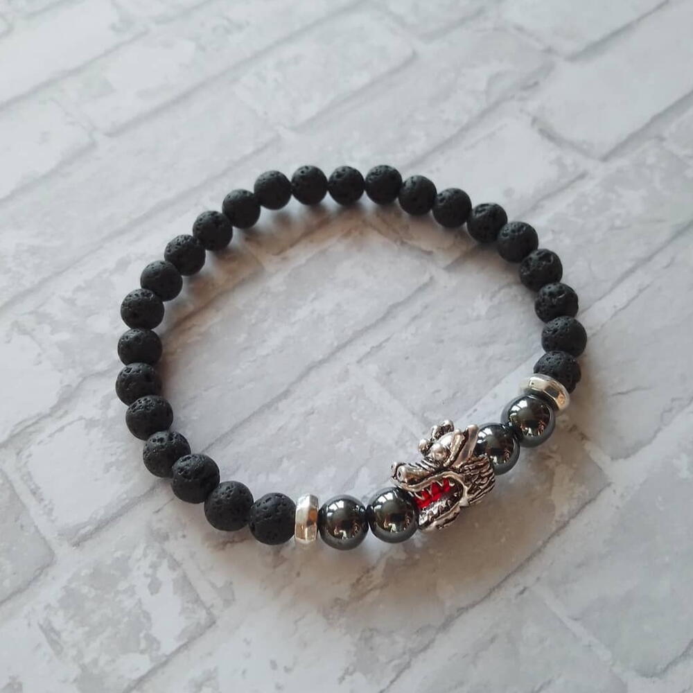 Черный браслет из вулканической лавы и гематита с бусиной в виде головы дракона. Размер 18. Подарок мужчине на 23 февраля.