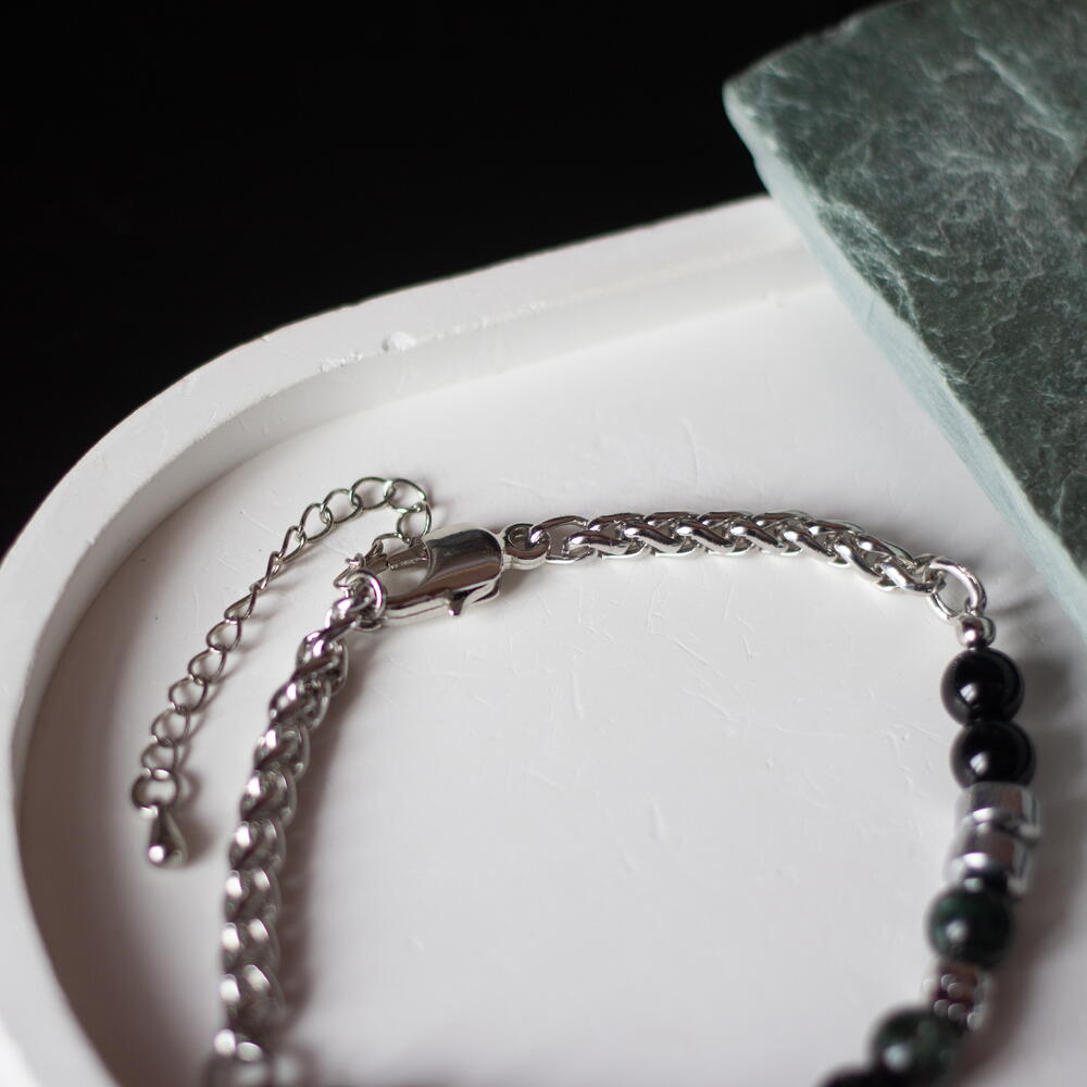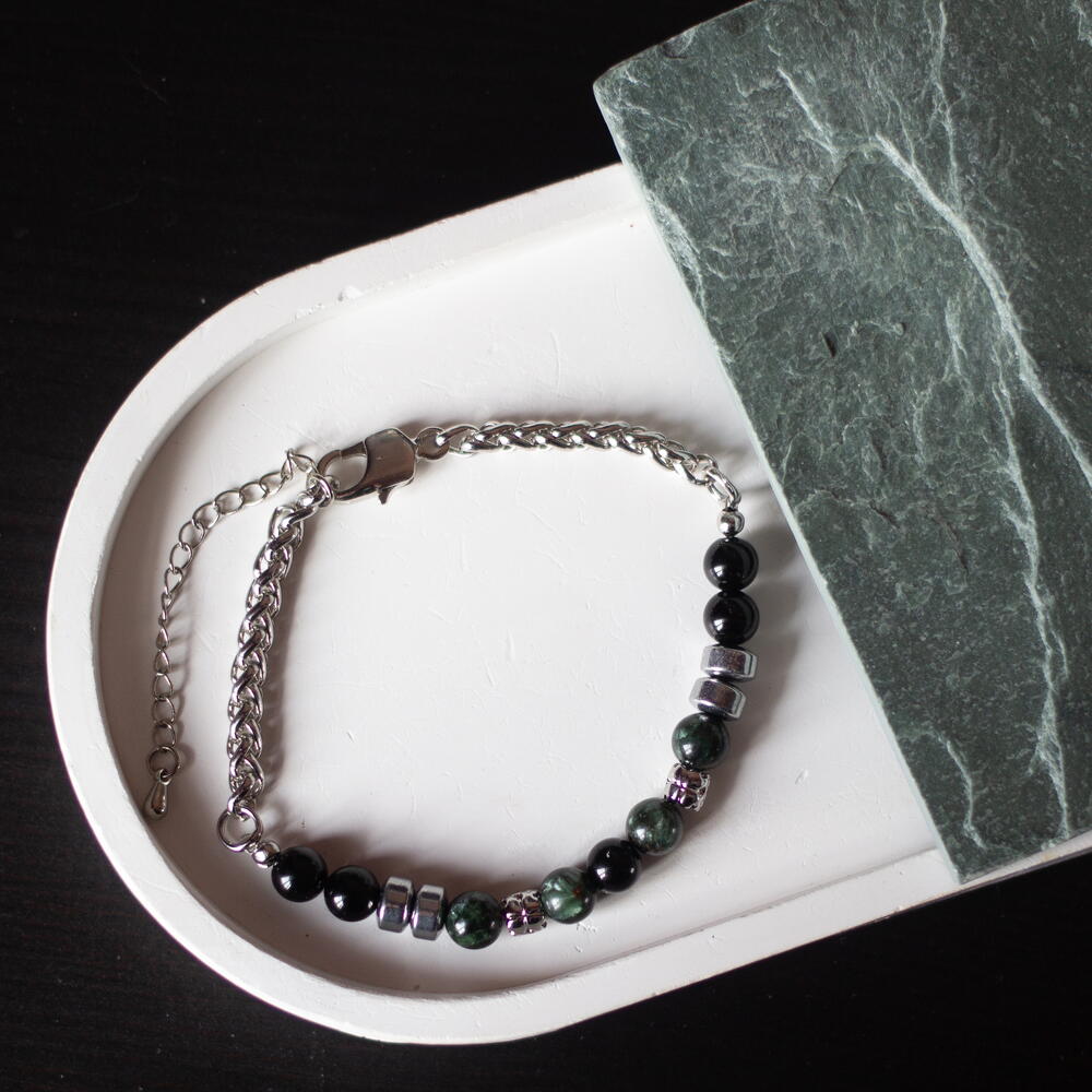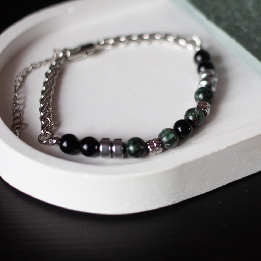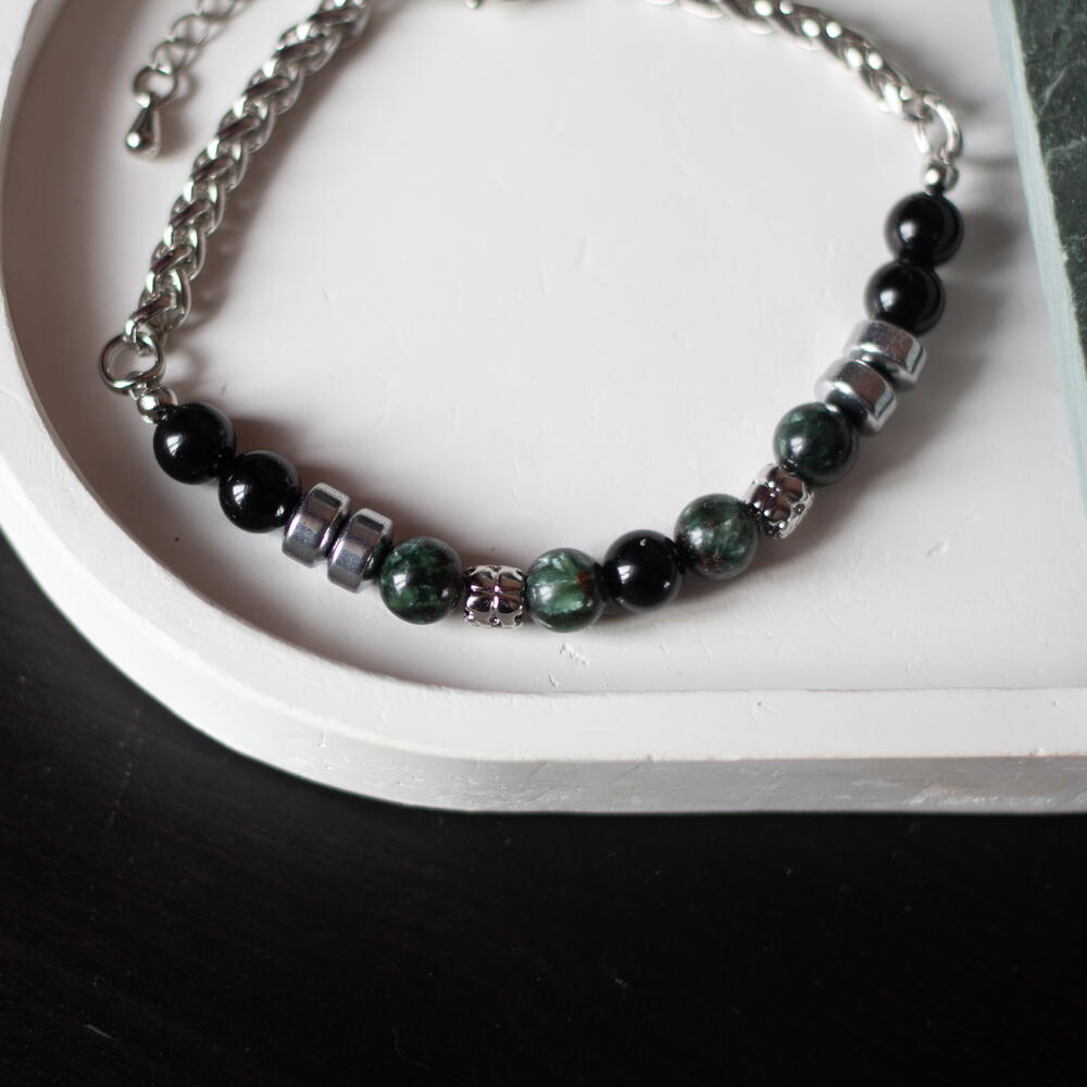 Мужской браслет на стальной цепочке с зелёным серафинитом (клинохлором) и чёрным агатом. Универсальный подарок для мужчины или папы. 📏 Технические параметры: – Размер браслета: 18,5 см включая карабин + удленительная цепочка 5см – Размер бусин: 4 мм – Основа на ювелирном тростке, фурнитура родированная. 💎 Минералы: – Серафинит — «ангельский» камень с серебристыми искрами; символизирует духовную защиту, исцеление и гармонию. – Чёрный агат ассоциируется с устойчивостью, границами и внутренней силой, защитой от негатива и поддержкой концентрации. Стиль и сочетания: – Браслет идеален для кэжуал и смарт-кэжуал: джинсы, рубашки, худи, кожаные куртки. – Носите соло или с часами; подходит для работы или повседневности как талисман баланса. 📦 Упаковка: — Стильная подарочная коробочка для заботливого хранения или приятного вручения. ♥️ Добавьте в избранное — изделие доступно в ограниченном количестве! __________________________________ Изделия созданы вручную с вниманием к каждой детали, а натуральные камни обладают своим неповторимым рисунком и оттенком, поэтому ваше украшение может немного отличаться — но в этом и есть его особый шарм.