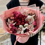 Құлпынай - 500 гр. Орхидея Цимбидиум - 5 дана Бұта раушаны - 3 дана Фисташка - 2 дана Малина - 80 гр. Дизайнерлік қаптама - 2 дана Лагурус (кептірілген гүл) - 9 дана роза кения - 3 дана