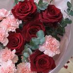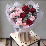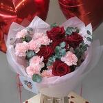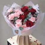 Авторский букет с диантусами, розами и душистым эвкалиптом