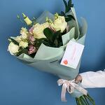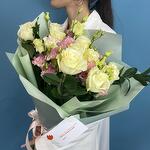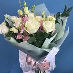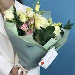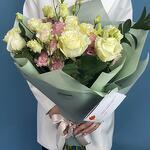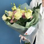 Нежная симфония из чувственной пионовидной розы, деликатной эустомы и экзотического ароматного эвкалипта вскружит голову любой девушке. Неспроста этот букет называется "ванильным пломбиром", цветовое сочетание кажется столь приятным и освежающим, что напоминает мороженое в жаркий июльский день. Сочетание из нежной и воздушной эустомы с россыпью розочек подойдет для подарка молодой девушке.