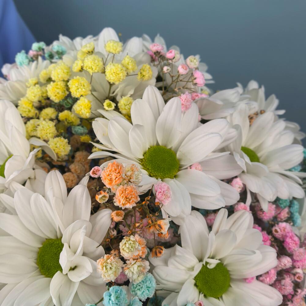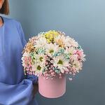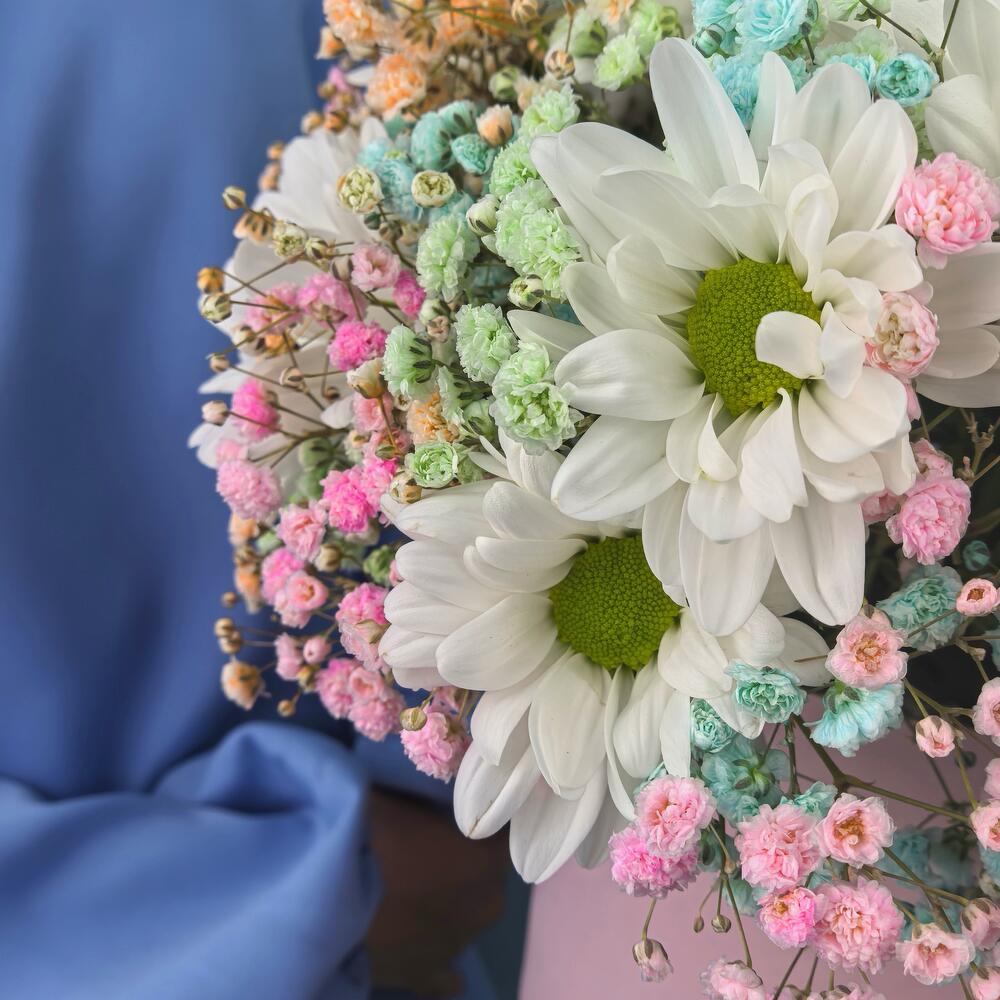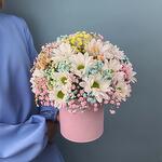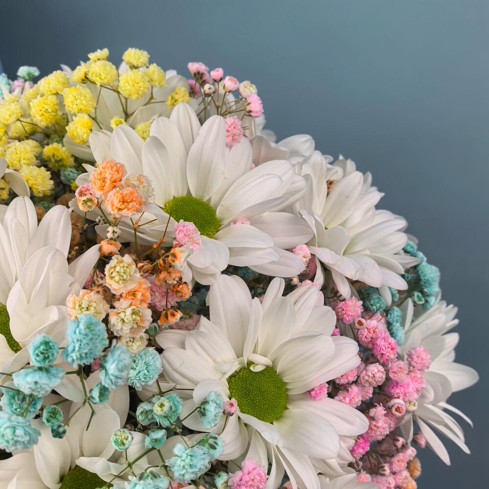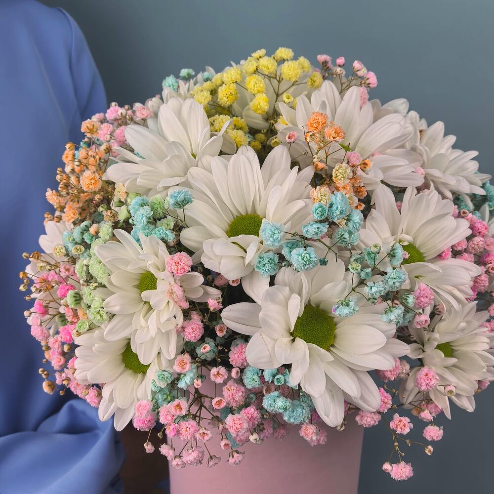 Нежная и стильная композиция в компактной шляпной коробке выполнена из: Белых хризантем — символов чистоты и спокойствия; Окрашенной хризантемы и гипсофилы в пастельных тонах — розовых, голубых, желтых и персиковых оттенков, добавляющих яркости и игривости. Цветы аккуратно размещены во влажной флористической губке, скрытой внутри коробки. Композиция идеально подойдет для подарка на любое событие: день рождения, благодарность, романтическое признание или просто знак внимания. 🌿 Правила ухода за композицией Полив: Добавляйте небольшое количество воды (50–100 мл) внутрь коробки, прямо на флористическую губку, каждые 1–2 дня. Делайте это аккуратно, чтобы не переувлажнить коробку. Расположение: Держите букет в прохладном месте (18–22°C), вдали от прямого солнца, отопительных приборов и сквозняков. Избегайте резких перепадов температуры. Уход: Удаляйте увядшие цветы по мере необходимости. По желанию можно слегка опрыскивать цветы (особенно окрашенные) чистой прохладной водой с расстояния 20–30 см. Срок свежести: При бережном уходе композиция будет радовать 5–10 дней.
