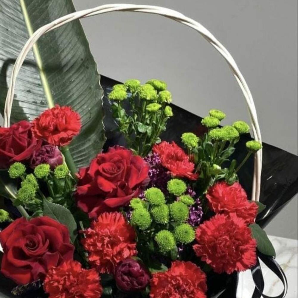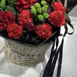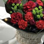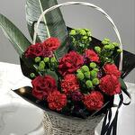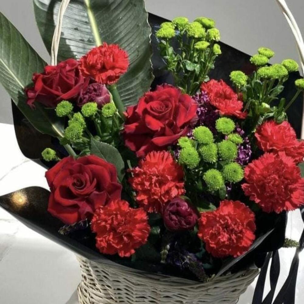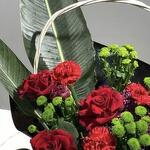 Корзина - 1 дана Бұта раушаны - 2 дана Бұталы хризантема - 4 дана Гвоздика - 7 дана Губка флористическая - 1 дана декоративная зелень - 2 дана листья магнолии - 2 дана раушан - 3 дана