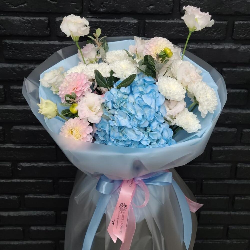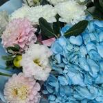 Hortensja - 1 szt. Chryzantema krzewiasta - 2 szt. Eustoma - 3 szt. Георгина - 3 szt. фейхоа зелень - 2 szt.
