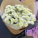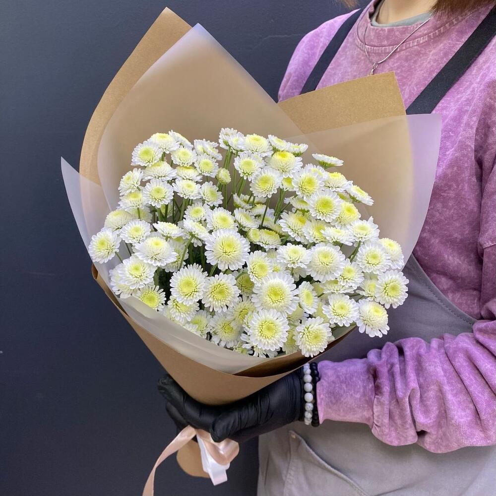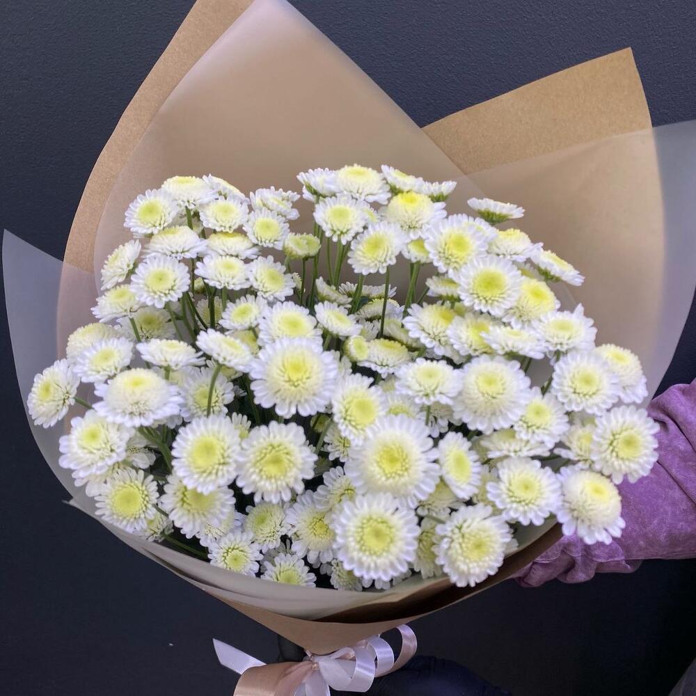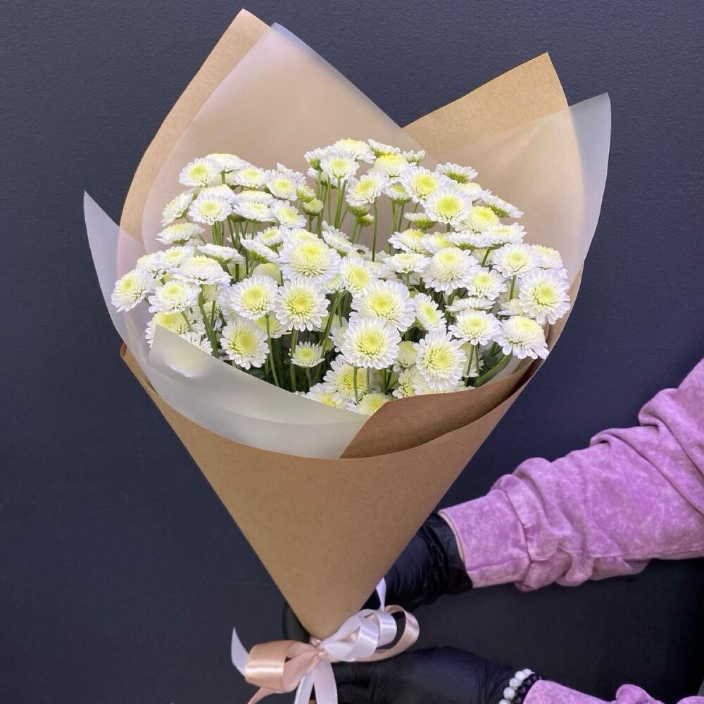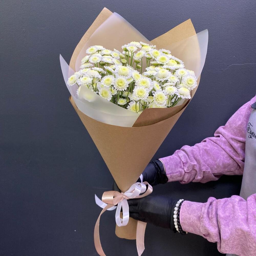 Chryzantema krzewiasta - 5 szt. Wstążka satynowa - 1 szt. Opakowanie designerskie - 1 szt.