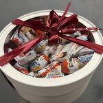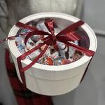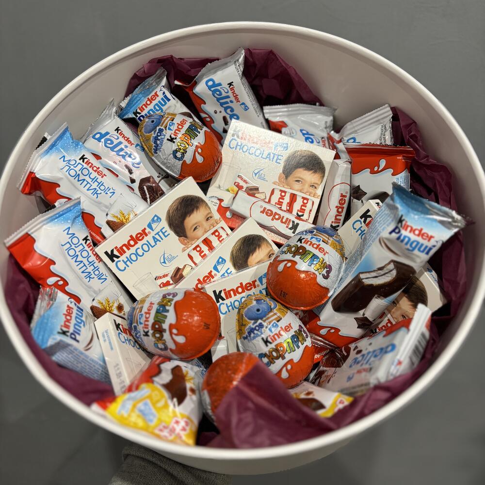 Pudełko kapeluszowe - 1 szt. Киндер сюрприз - 5 szt. Киндер шоколад - 7 szt. Киндер Делис - 5 szt. Декор лентами - 1 szt. молочный ломтик киндер - 10 szt.