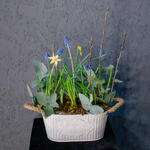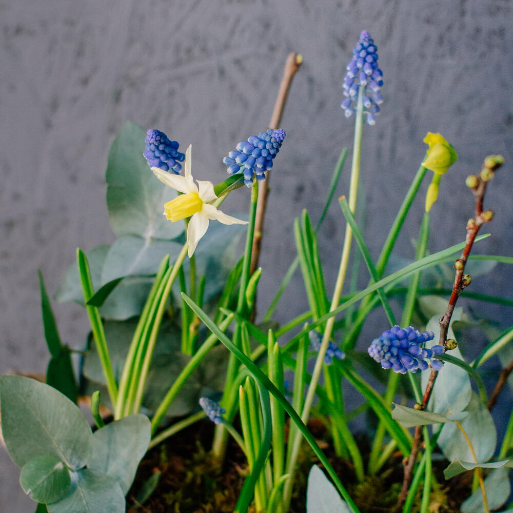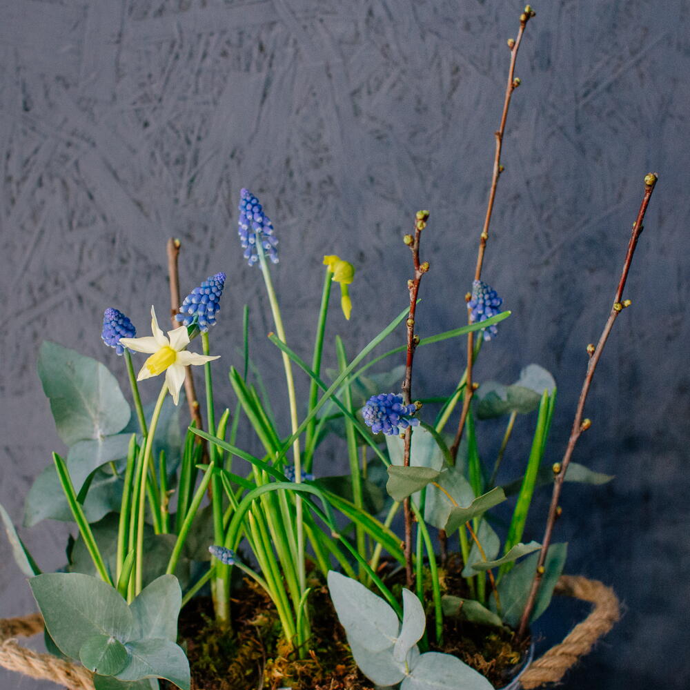 Весенняя романтичная композиция с луковичными нарциссами и мускари — лёгкая, свежая и по-настоящему живая. Нежные нарциссы и яркие мускари создают ощущение пробуждающейся природы, изящные веточки добавляют графичности, мох — естественности, а эвкалипт придаёт композиции лёгкий аромат и воздушность. Такой вариант идеально подойдёт для создания весеннего настроения в доме или в качестве тёплого подарка. Композиция выглядит натурально и трогательно, словно кусочек цветущего сада, который поселился прямо у вас на столе.