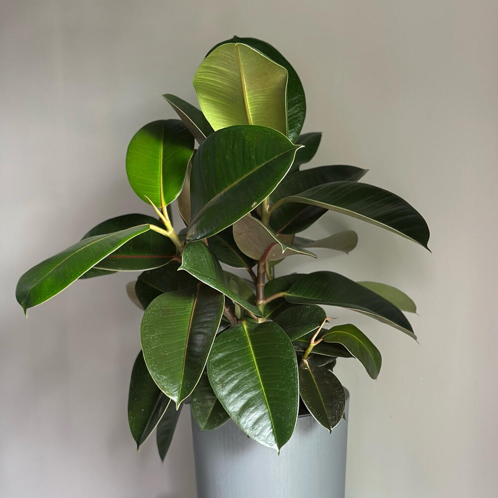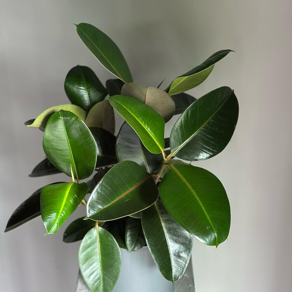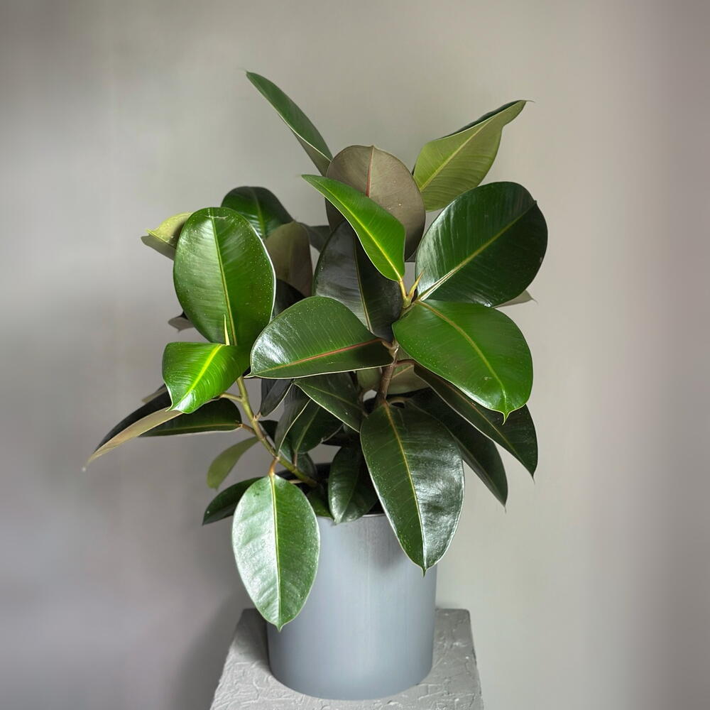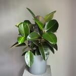 Один из самых популярных, быстрорастущих и неприхотливых фикусов с элегантными плотными темно-зелеными листьями. Он прекрасно адаптируется к вашему дому, украсит интерьер или добавит природности офисной обстановке. Из пряморастущих веток этого фикуса Вы легко сможете сформировать чудесное деревце, обрезая его крону. Блестящие листья этого растения вызовут восторг у ваших коллег и домочадцев. У себя на родине, в Индии, фикус считается священным растением, он очищает не только воздух, но и энергетику пространства. Фикус Эластика имеет второе название каучуконосный из-за содержания каучука в соке растения. Поэтому, чтобы не вызвать аллергию, стоит ограждать маленьких детей и домашних питомцев от листьев фикуса.