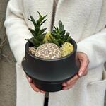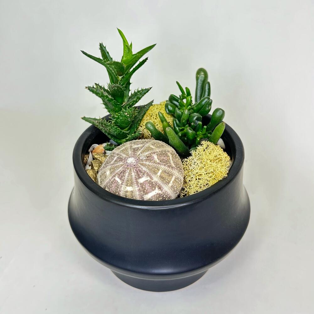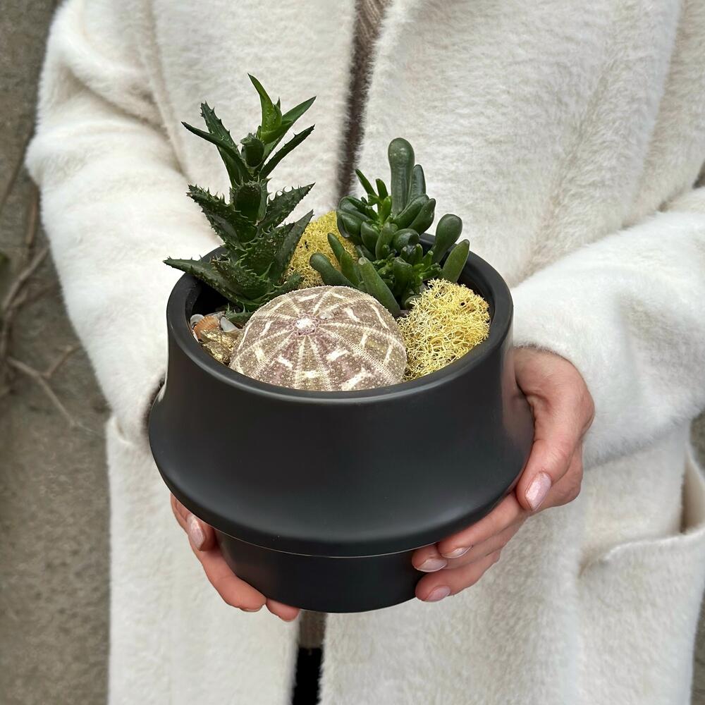 Цветочная композиция с различными видами суккулентов, кактусов в сером кашпо с декоративными засыпками натуральных оттенков. Нутаральные ракушки, плоские камушки, цветная галька. Растения высажены в специализированный грунт LECHUZA-PON, декоративные элементы придают определенный шарм композиции, и всеми любимые суккуленты! Дизайнерское кашпо -керамика. Такая композиция интерьерно смотрится в любом месте-квартира, загородный дом или ресторан, бар, салон красоты. Доставим в красивом подарочном пакете!