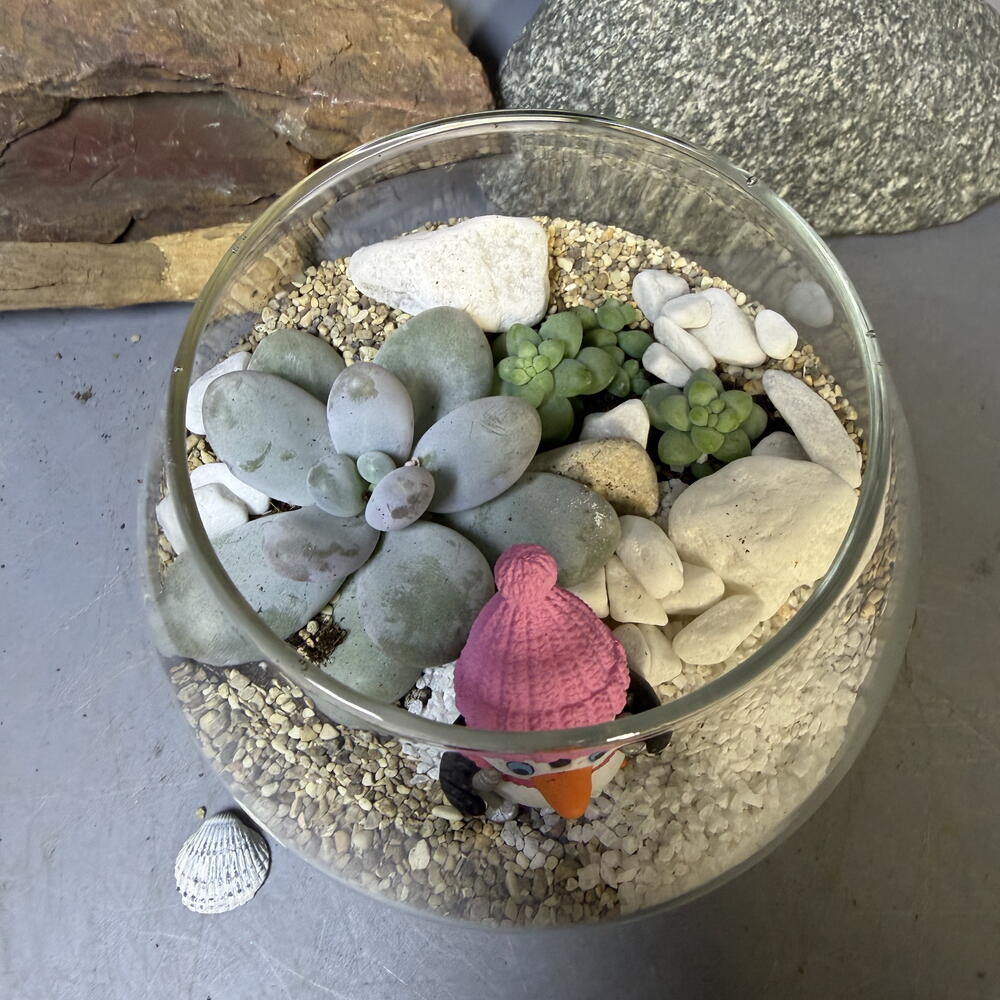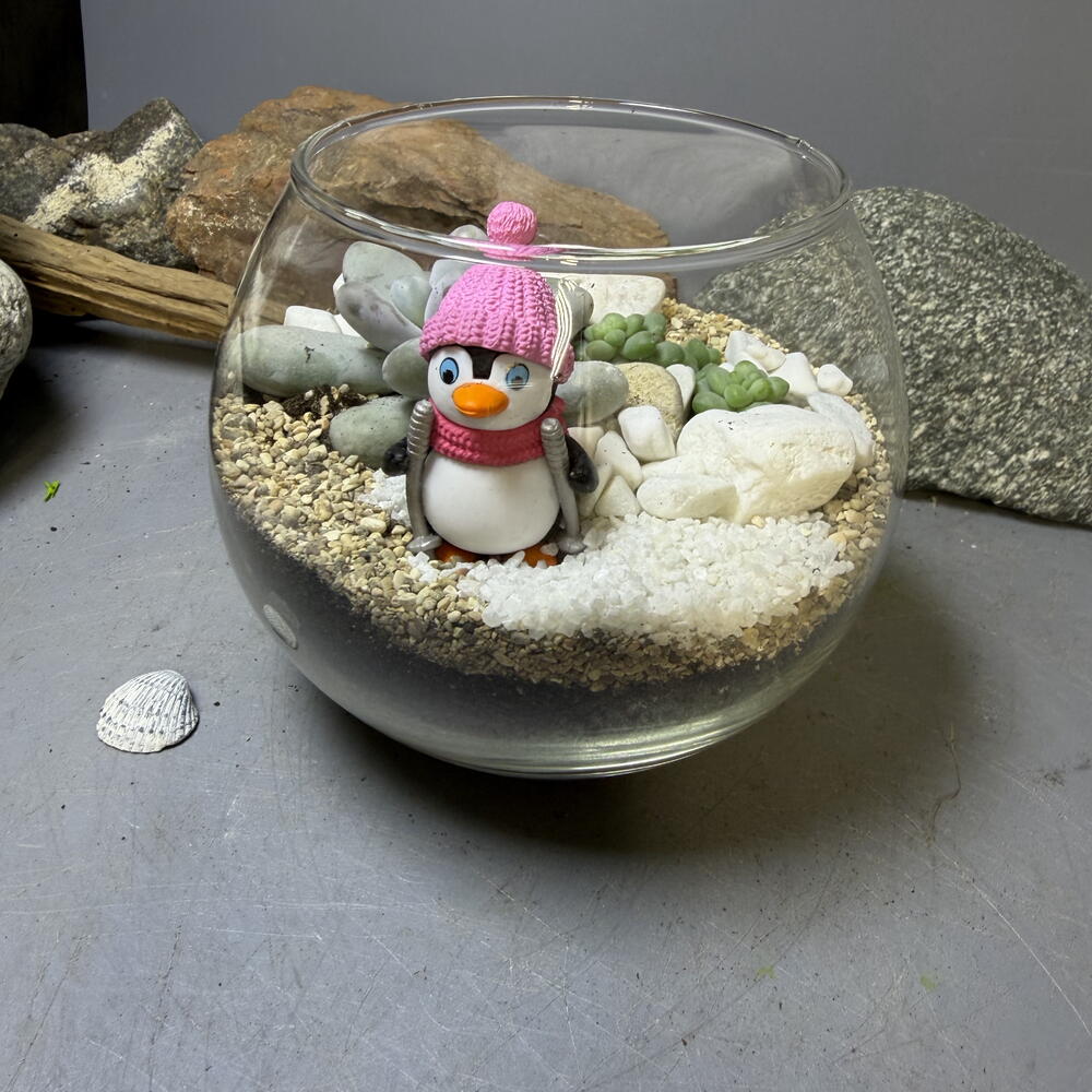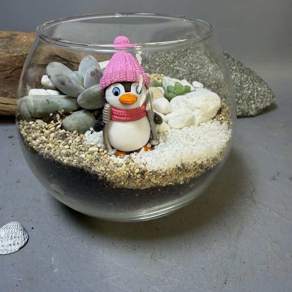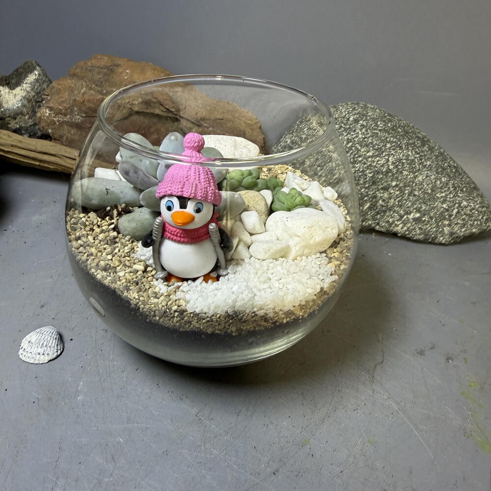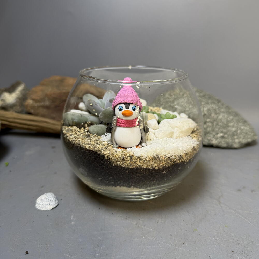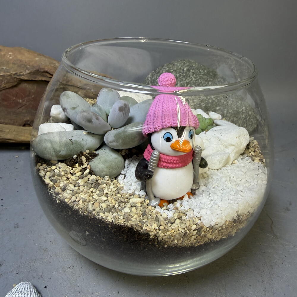 Флорариум с фигуркой пингвина Пингвиненок в шапке и суккулентами, подарок