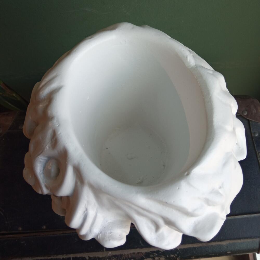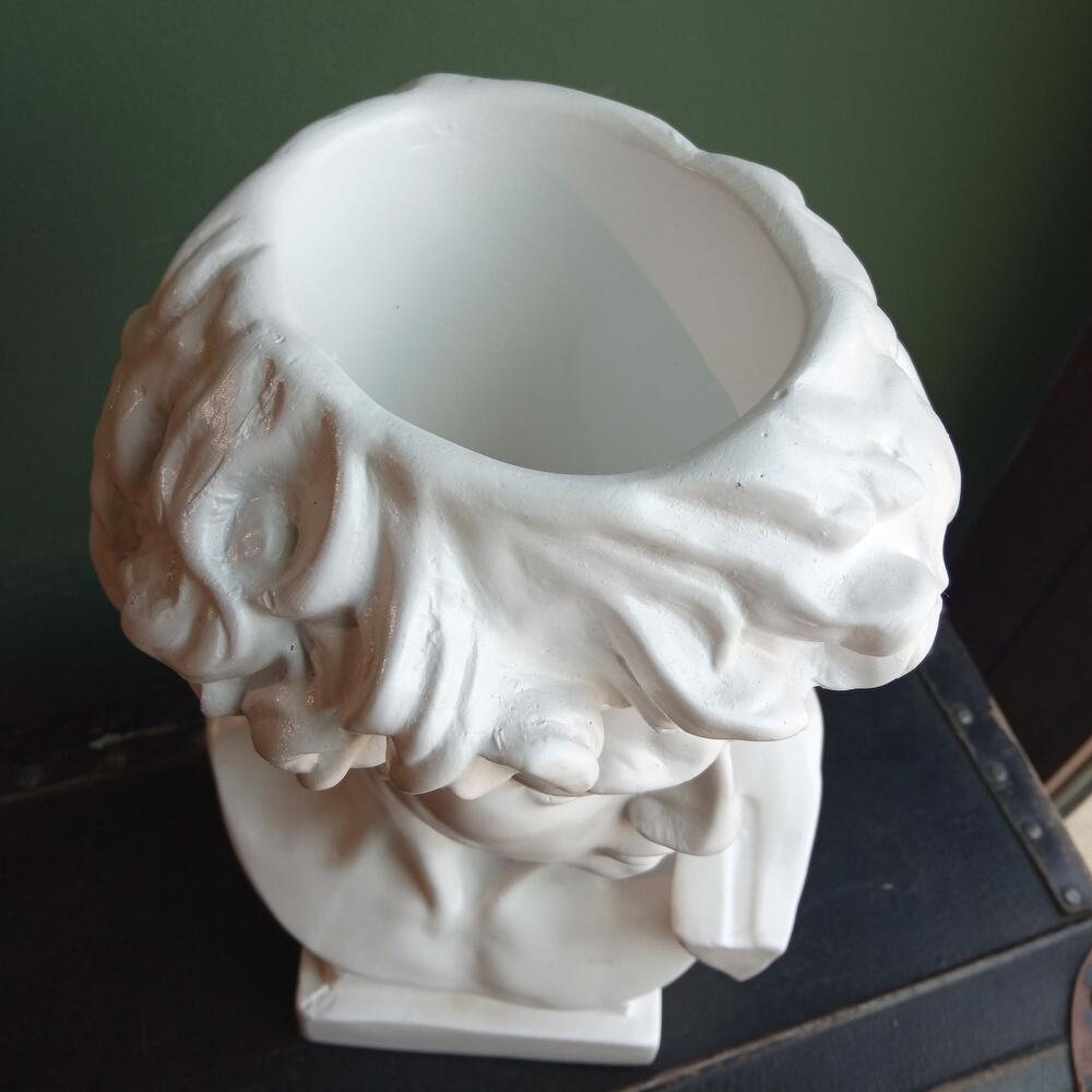 Кашпо керамическое в форме скульптуры. Окрашеное. Покрытие в меру глянцевое. Без отверстий для слива воды. Глубина отверстия 10 см ширина 7 см. Прекрасно подойдёт как для искуственных растений, так и для живых. Для хранения мелочей, или как самодостаточный элемент интерьера.