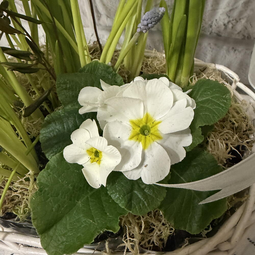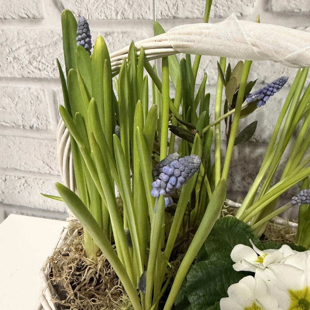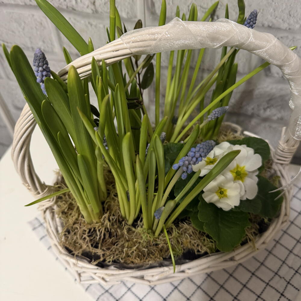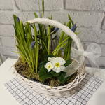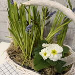 Композиция первоцветов в корзинке: мускари, нарциссы, примула