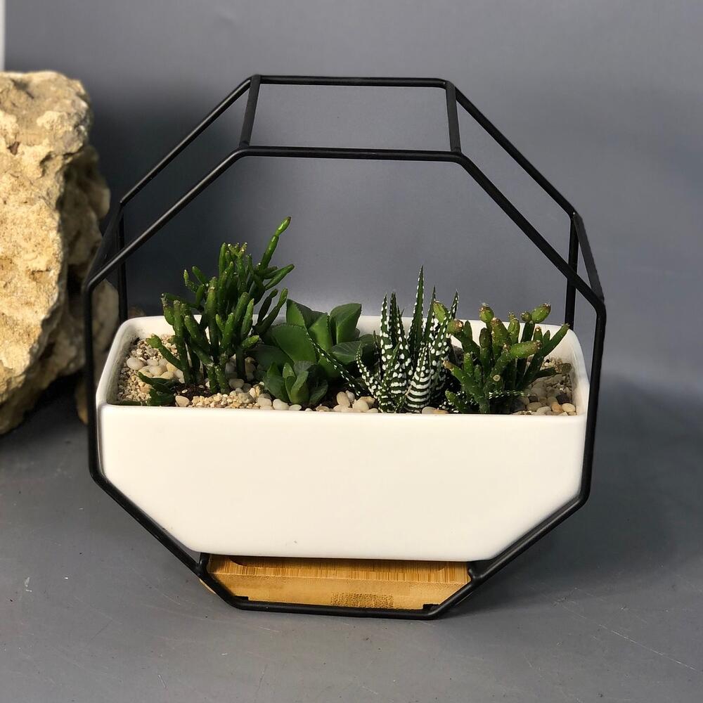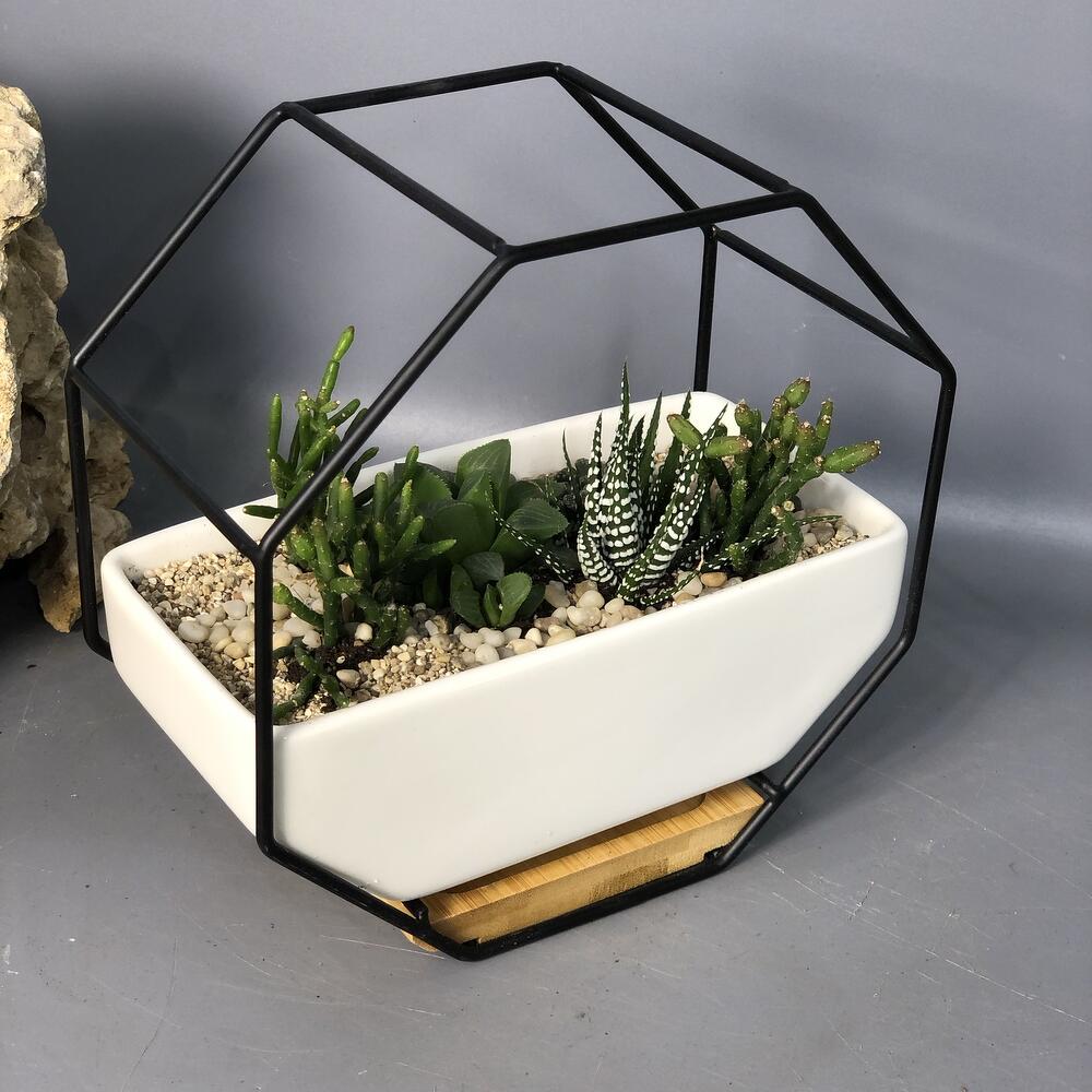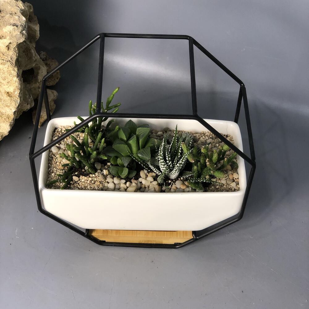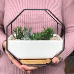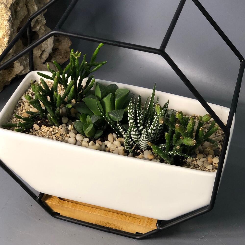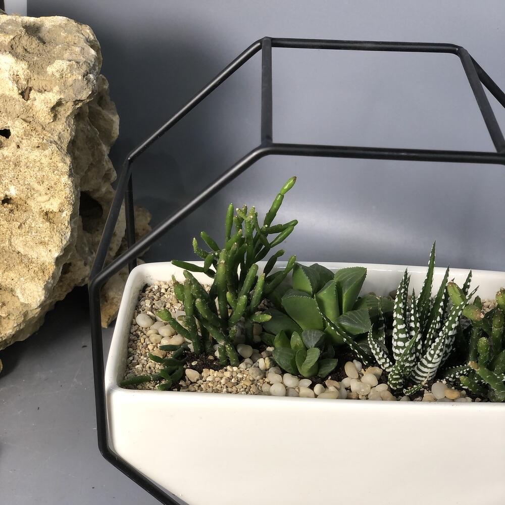 Стильное кашпо с суккулентами. Использованы самые неприхотливые виды: рипсалис, хавортии. Не требуют дополнительного освещения и частного полива. Посажены в рыхлый грунт для суккулентов. Инструкция по уходу прилагается. Композиция может быть использована как подвесной элемент декора. Флорариум упаковывается в минималистичный крафт пакет с уплотненным дном. Если вам необходима коробка для транспортировки флорариума на дальние расстояния, пожалуйста, напишите нам