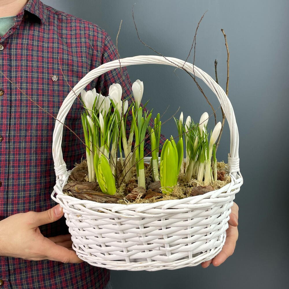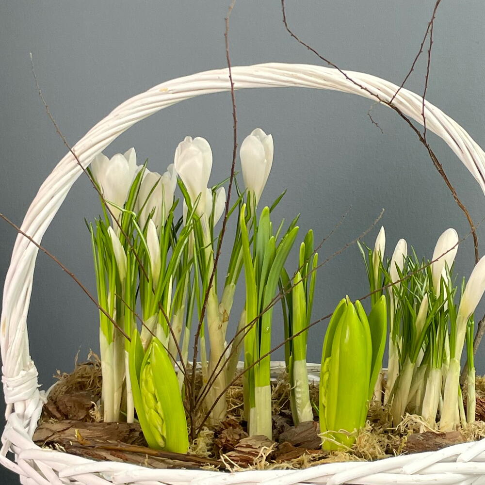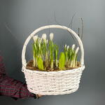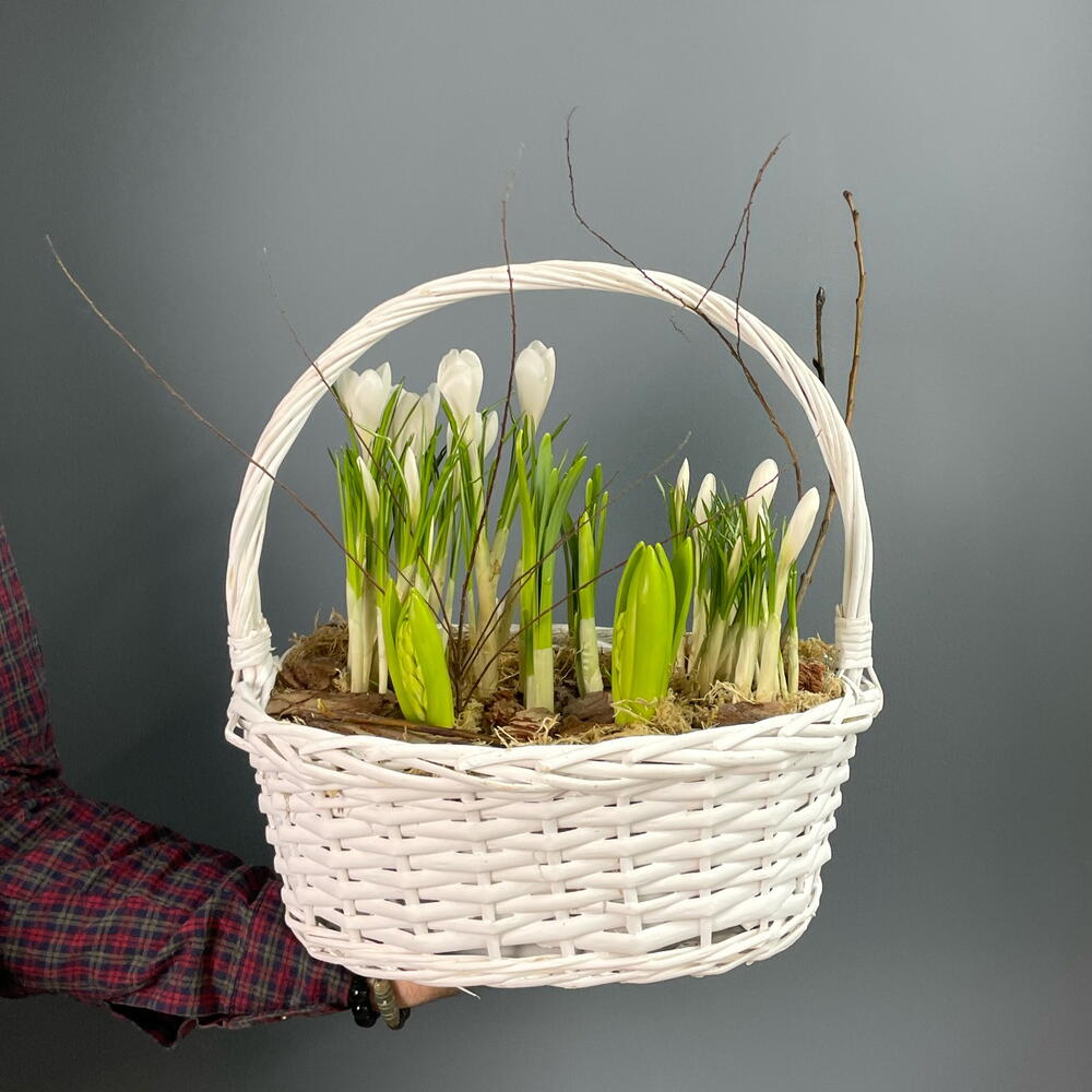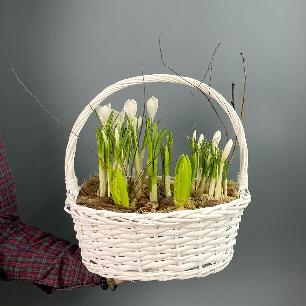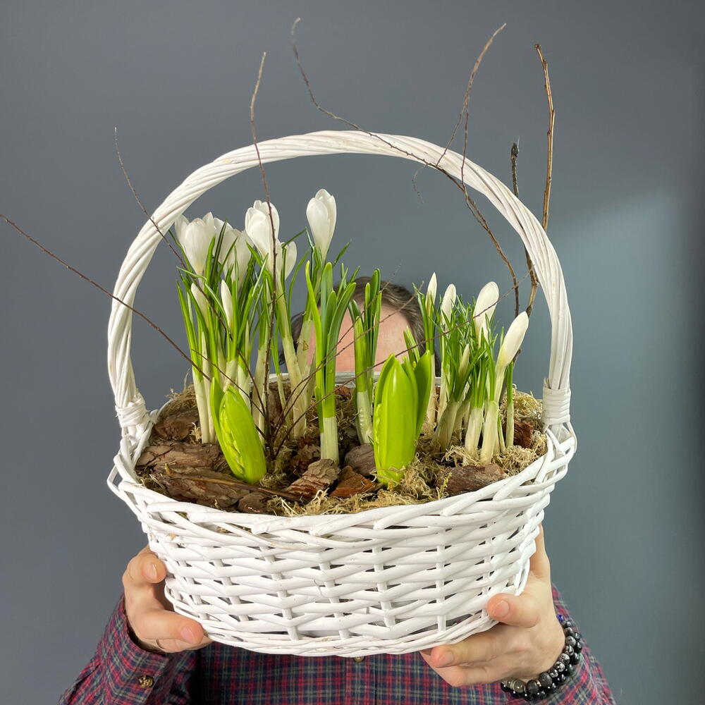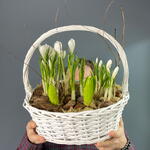 Корзина с первоцветами луковичные крокусами и гиацинты