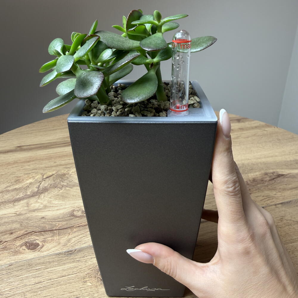 Крассула овата «Минор» в матовом кашпо MINI CUBI цвета антрацит Символ благополучия в строгой геометрии. Крассула овата «Минор», или компактная денежное дерево, — это идеально сформированный суккулент с мелкими, толстыми листьями благородного нефритово-зеленого цвета, часто имеющими красноватую окантовку на солнце. Его аккуратная, плотная крона воплощает гармонию и устойчивость. Это миниатюрное дерево-талисман представлено в безупречном современном обрамлении — матовом кашпо Lechuza MINI CUBI цвета антрацит. Четкие линии куба и глубокий темно-серый, почти черный, оттенок кашпо создают эффект выставочного подиума, подчеркивая сочную зелень, совершенную форму и «скульптурность» крассулы. Это лаконичный арт-объект для ценителей минимализма. ✨ Преимущества готового решения от «Садов Ананды»: ✔ Готовый композиционный акцент. Растение уже высажено нашими специалистами в идеально сочетающееся кашпо. Это законченное дизайнерское решение. ✔ Идеальный грунт для суккулента. Используется профессиональный, хорошо дренированный субстрат Lechuza-pon, который обеспечивает здоровье корней и предотвращает загнивание. Гарантируем полное отсутствие вредителей в грунте. ✔ Современная элегантность. Глубокий матовый антрацит служит безупречным сдержанным фоном, который выставляет напоказ сочную текстуру и идеальные пропорции крассулы, делая её стильным акцентом в любом интерьере. ✔ Неприхотливый талисман. Крассула легка в уходе, символизирует процветание и десятилетиями сохраняет свою декоративную форму. 📏 Параметры: Растение: Крассула овата «Минор» (Crassula ovata Minor) Высота с кашпо: ~25 см Ширина композиции: ~9.5 см Кашпо: Lechuza MINI CUBI (матовый антрацит) Грунт: Профессиональный субстрат для суккулентов Lechuza-pon Крассула «Минор» в кашпо цвета антрацит — это больше, чем растение. Это живой талисман строгой красоты и стабильности, воплощение современной эстетики и философии минимализма.