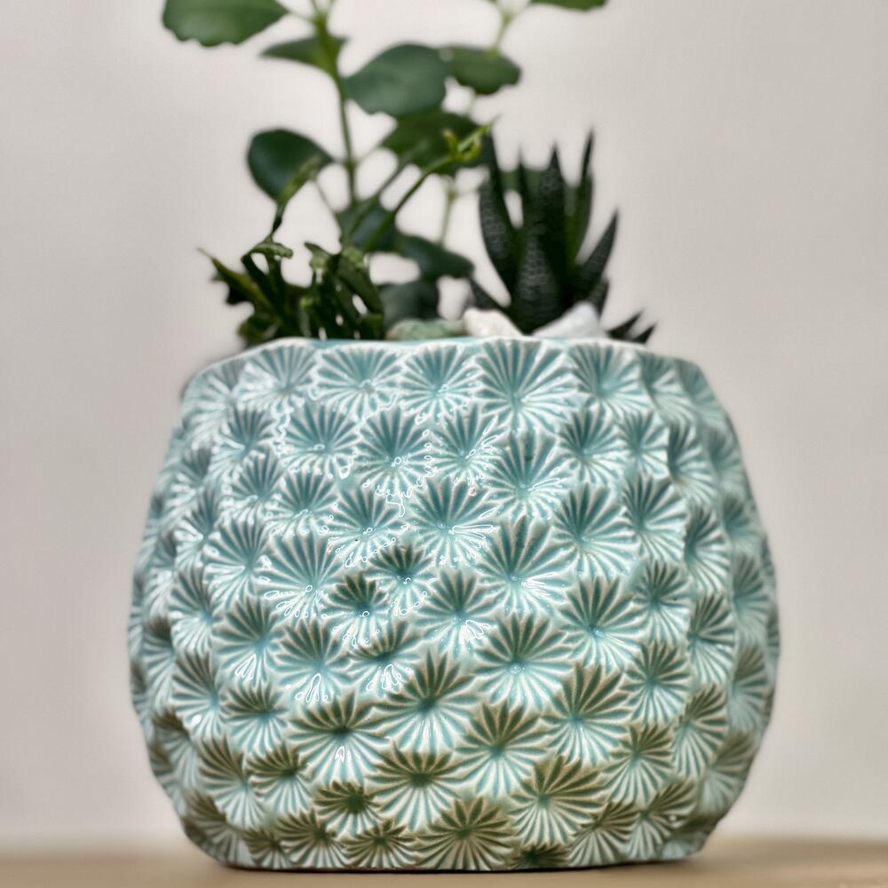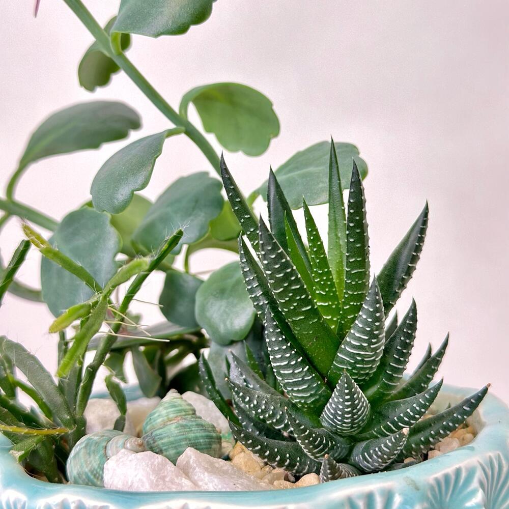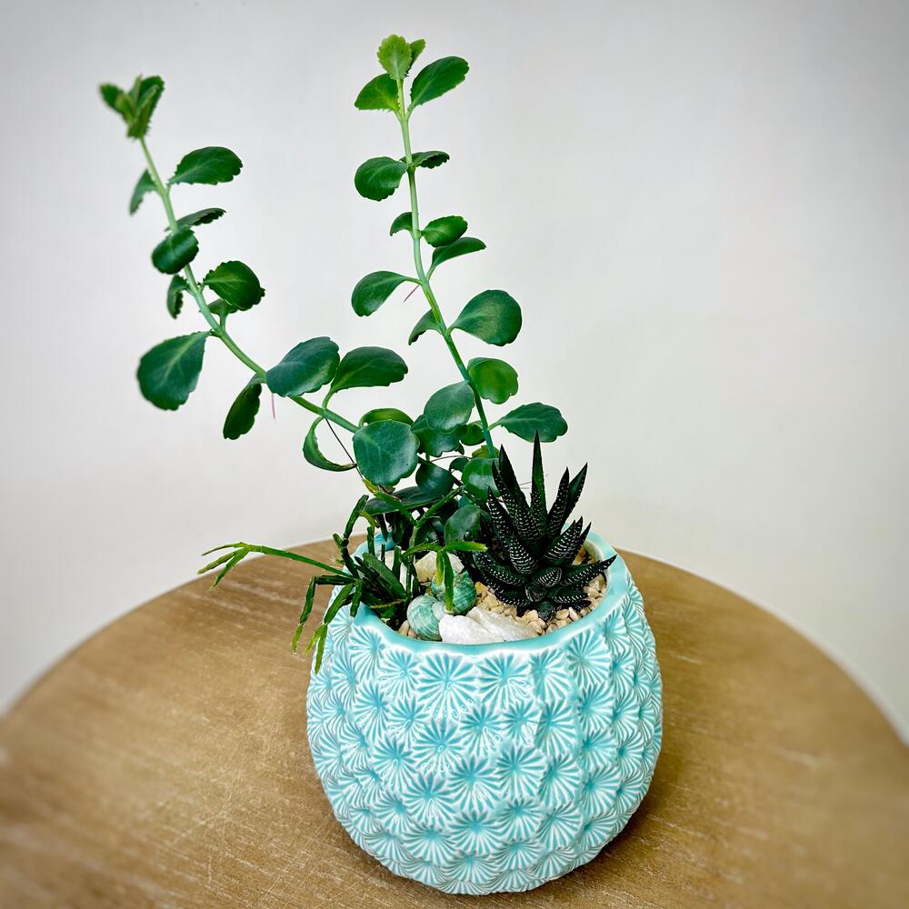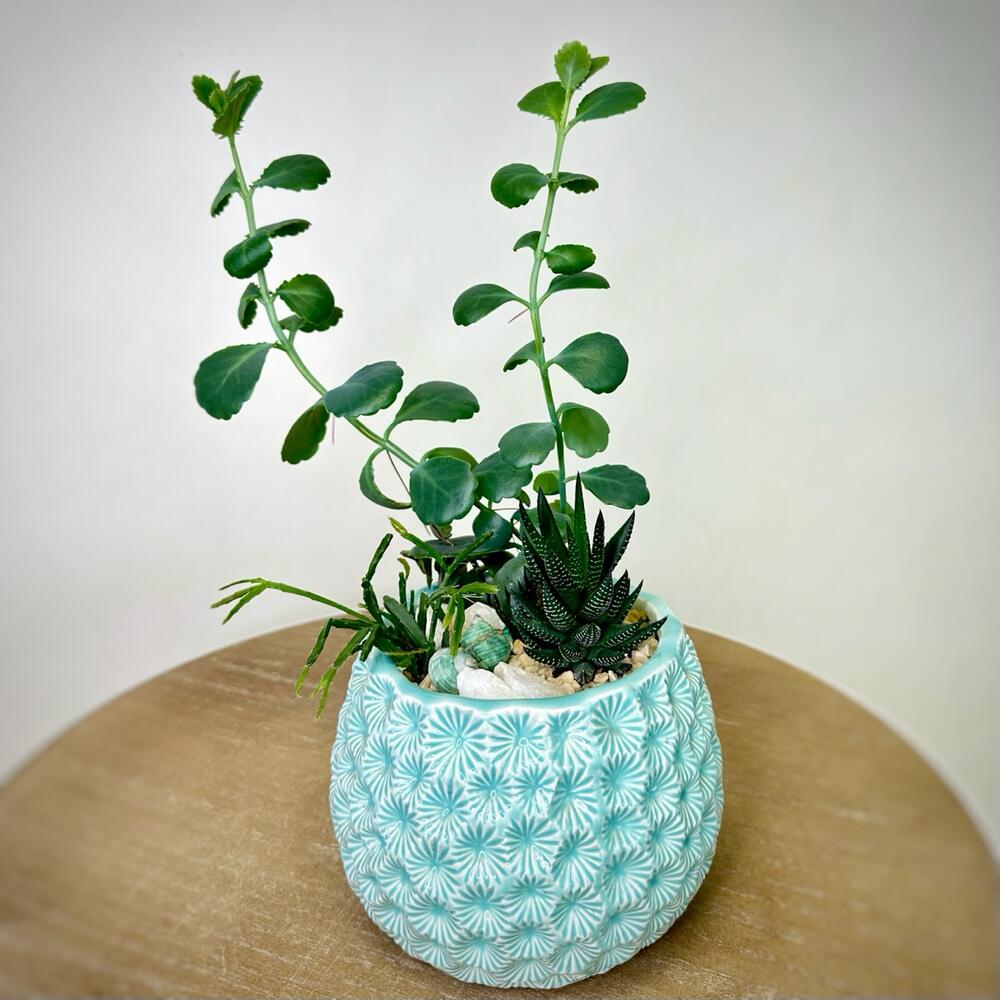 Прекрасный подарок для тех, кто любит миниатюрные комнатные садики из суккулентов. Композиция в керамическом кашпо, декор - мраморные камушки, цветной песок, ракушки. Бережно поставим в красивый подарочный пакет.