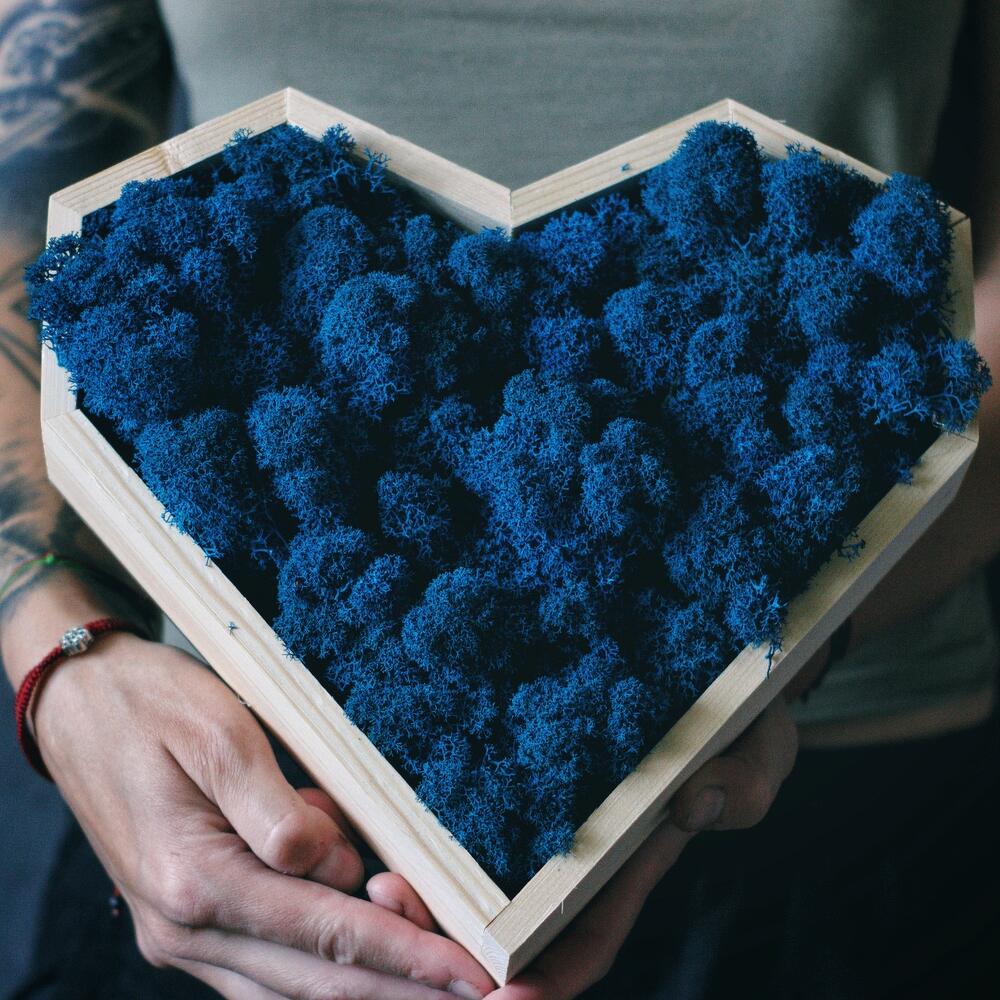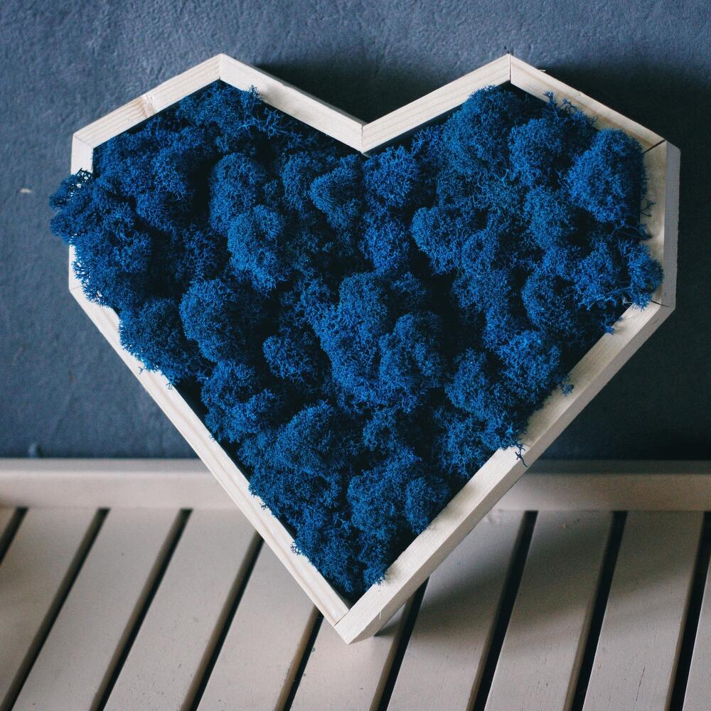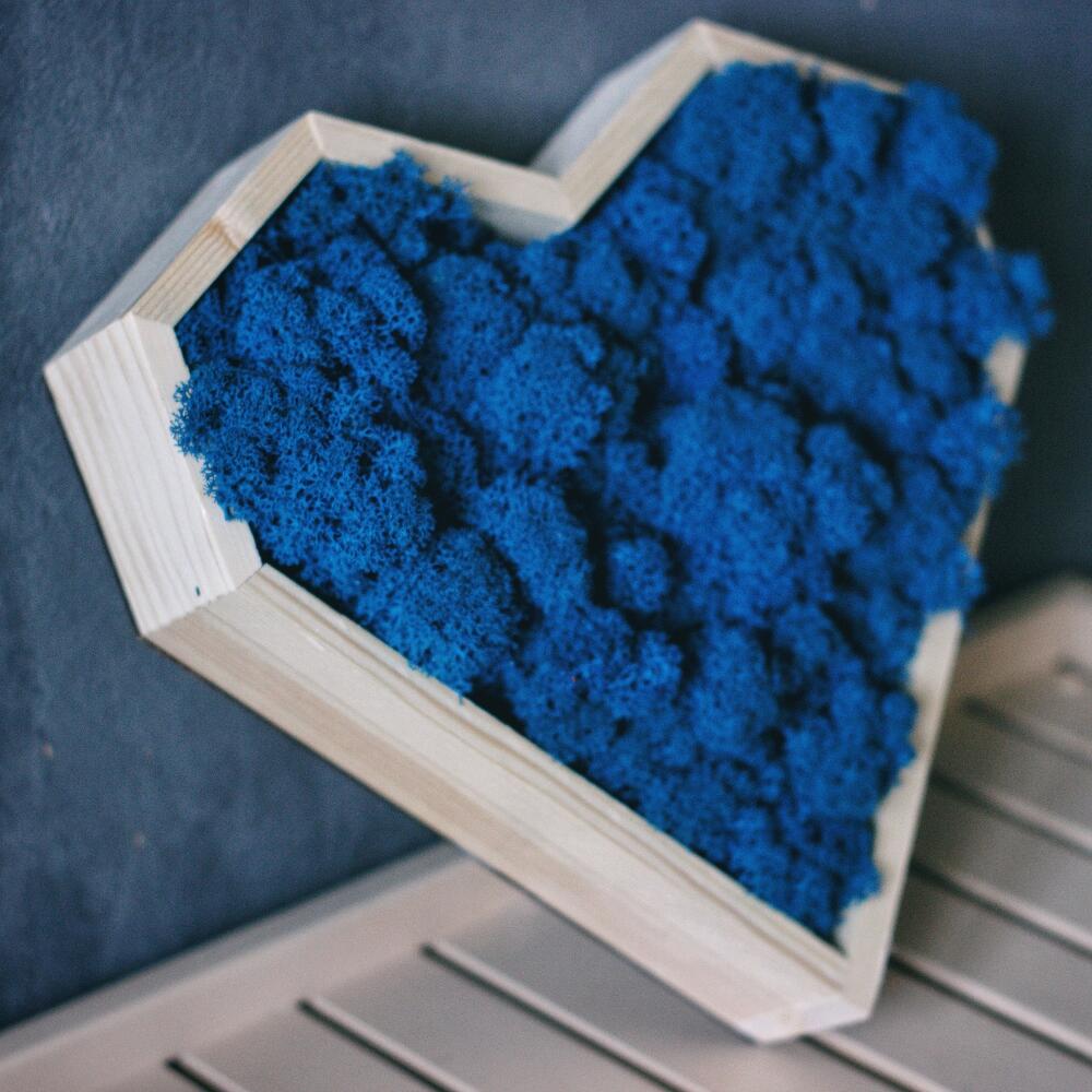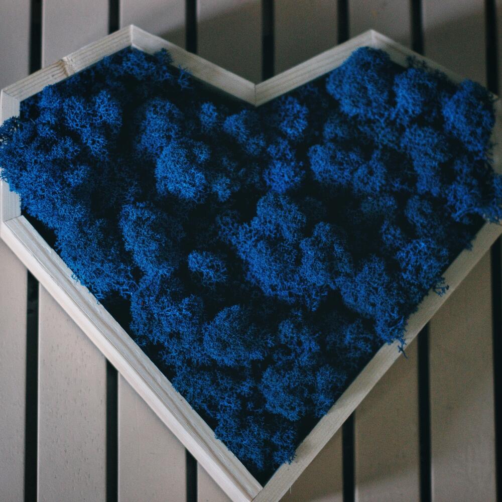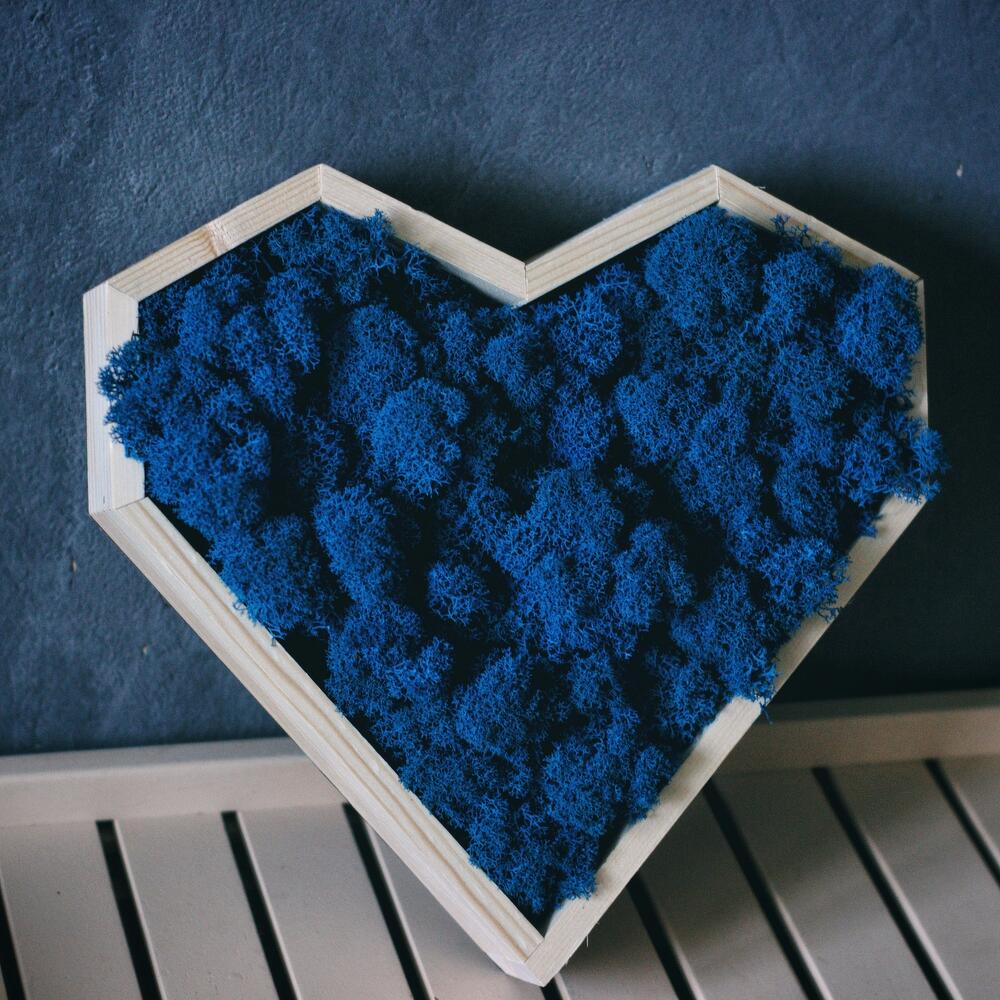 Панно в форме сердца со стабилизированным синим мхом, который отличается большим сроком жизни. Композиция сохраняет свой первозданный вид до 3 лет! Панно украсит любой интерьер, озеленит и добавит уют дому и станет ярким и оригинальным подарком. Оно не завянет, как цветы и будет долго радовать получателя. Композиция упаковывается в подарочное оформление, при желании можно добавить открытку
