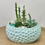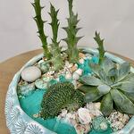 Роскошная композиция из суккулентов в прекрасном нежно-бирюзовом керамическом кашпо. В качестве декора использован цветной песок, ракушки и галька.