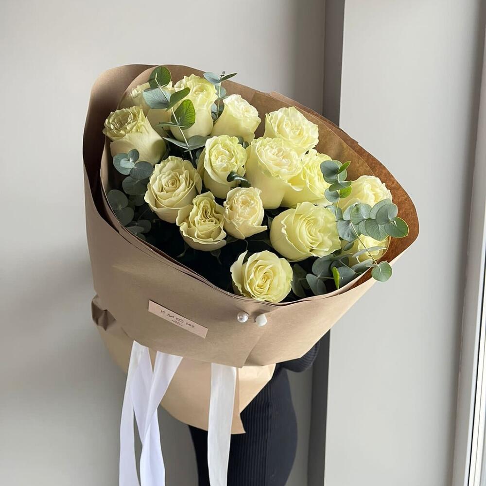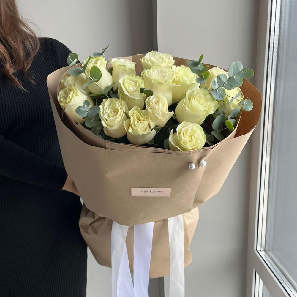 Белые розы с эвкалиптом