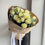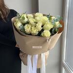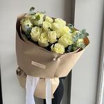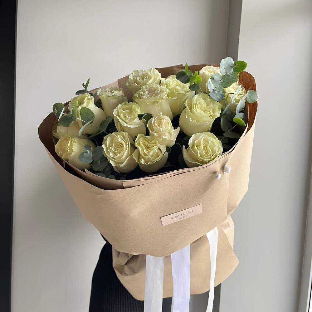 Лента - 1 шт. Писташ - 3 шт. Эвкалипт - 2 шт. Упаковка дизайнерская - 1 шт. Бусина - 1 шт. Эквадор роза - 15 шт. аквапак с водой - 1 шт. памятка по уходу и подкормка для цветов - 1 шт.