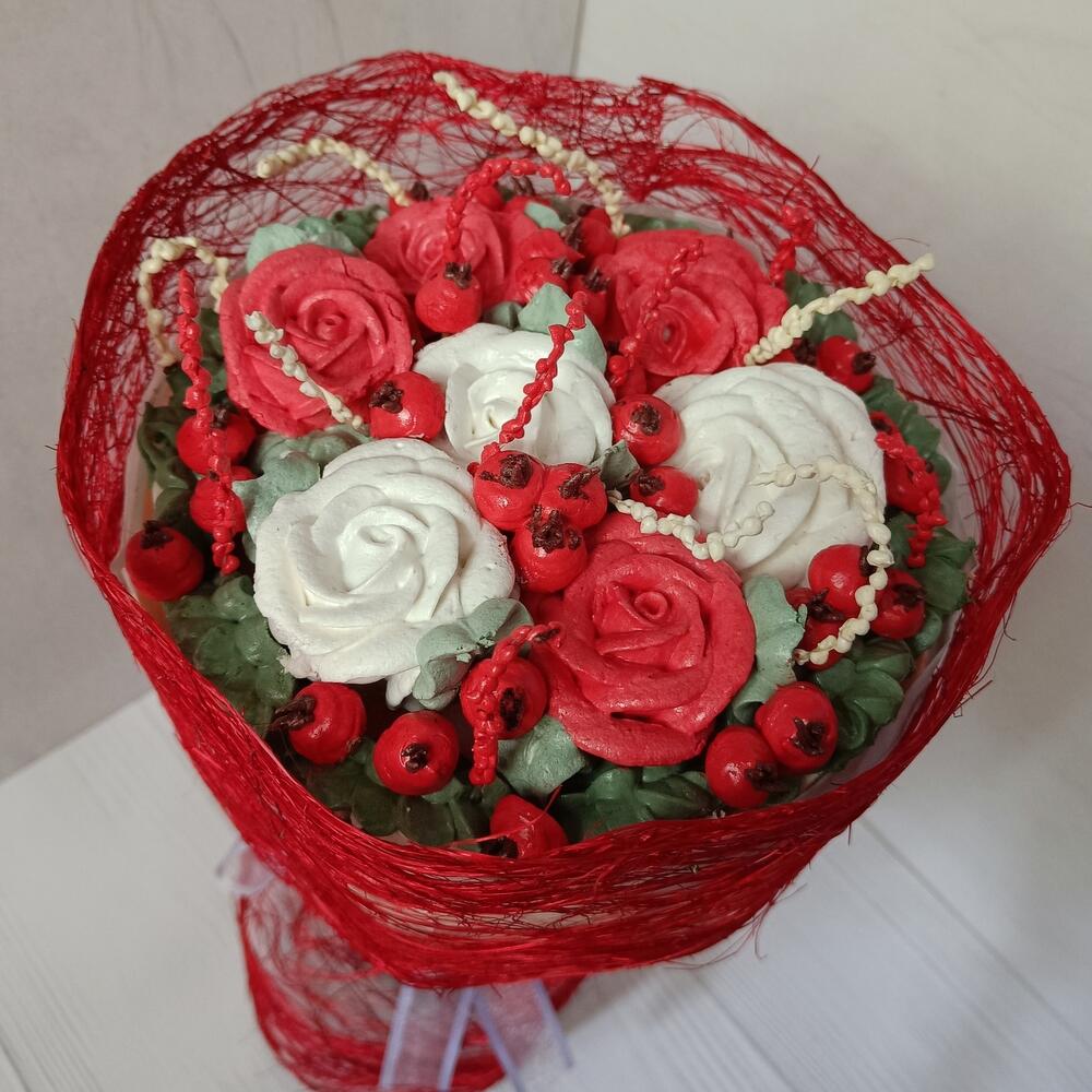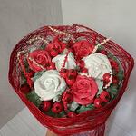 Королевой цветов по праву считается роза. Классическое сочетание белого и красного цвета для девушек и женщин любого возраста. Я собрала два этих понятия в один букет. Букет роз из зефира для любого повода или даже без повода. Размер букета 26-28см. Букет упакован в целлофан,что гарантирует свежесть зефира, гигиену(отсутствие пыли и пр. на букете во время транспортировки),защита от излишней влаги.
