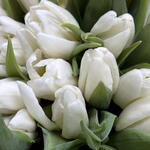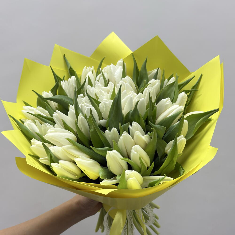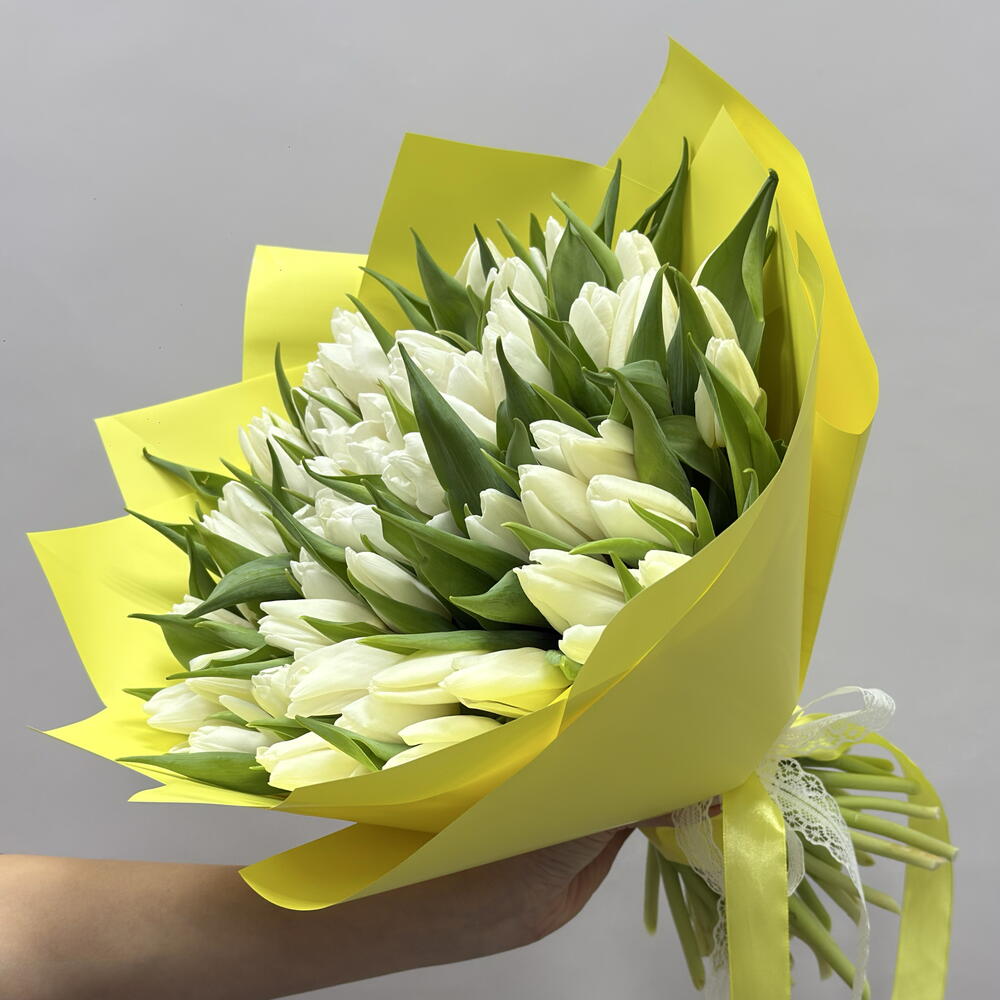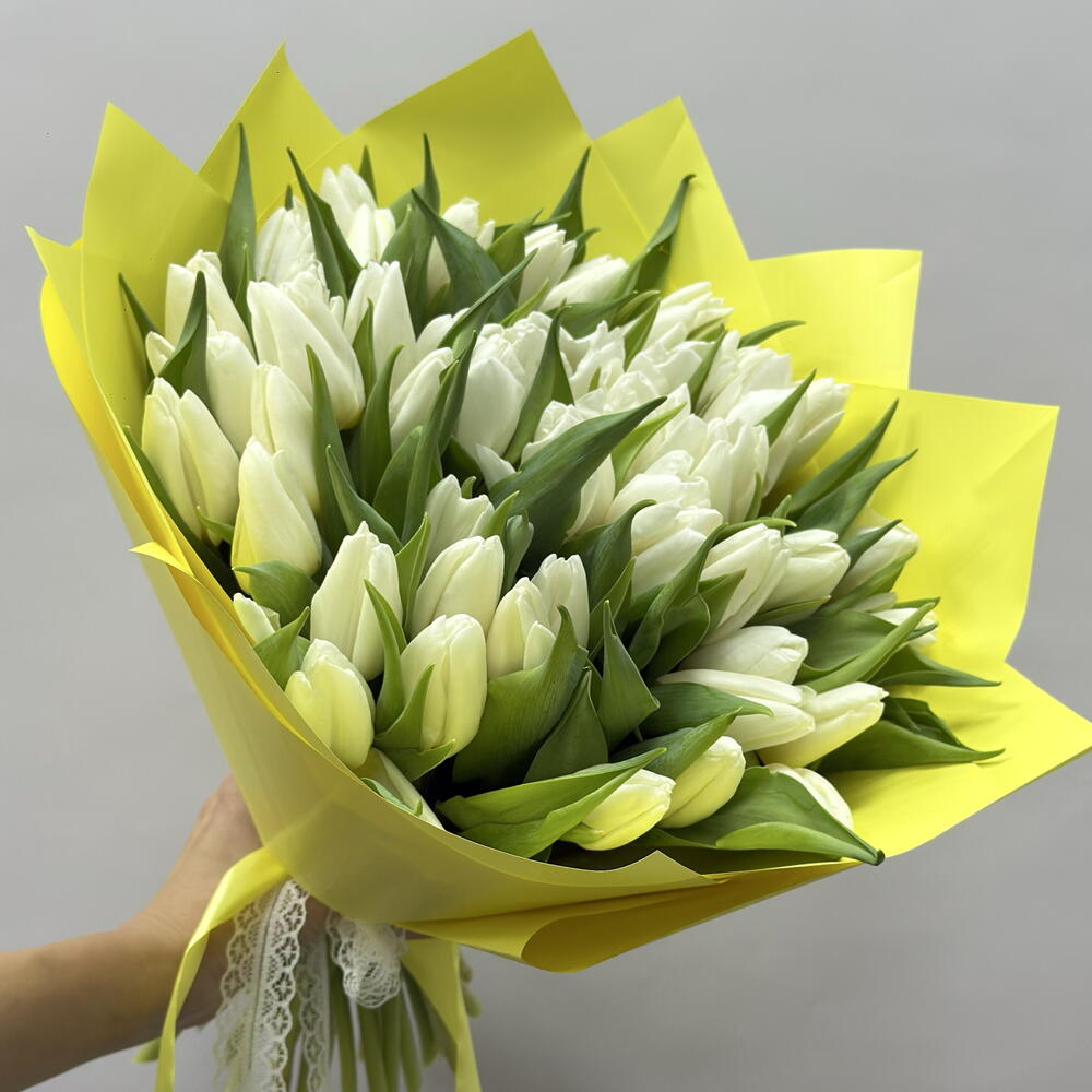 Лента атласная - 1 шт. Упаковка дизайнерская - 1 шт. Лента ажурная - 1 шт. тюльпаны белые - 49 шт.
