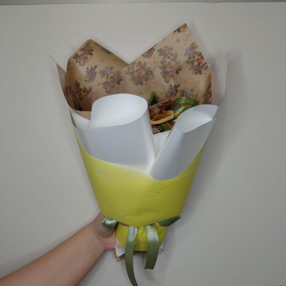 Лента атласная - 1 шт. Еловая ветка - 1 шт. Корица палочки - 2 шт. апельсин сушеный - 1 шт. бумага флористическая - 2 шт. пленка флористическая - 1 шт. бант атласный тройной - 1 шт. дикая вишня - 40 гр. саусеп ( черный чай) - 40 гр. королевский десерт (черный чай) - 40 гр. фетр флористический желтый - 1 шт.