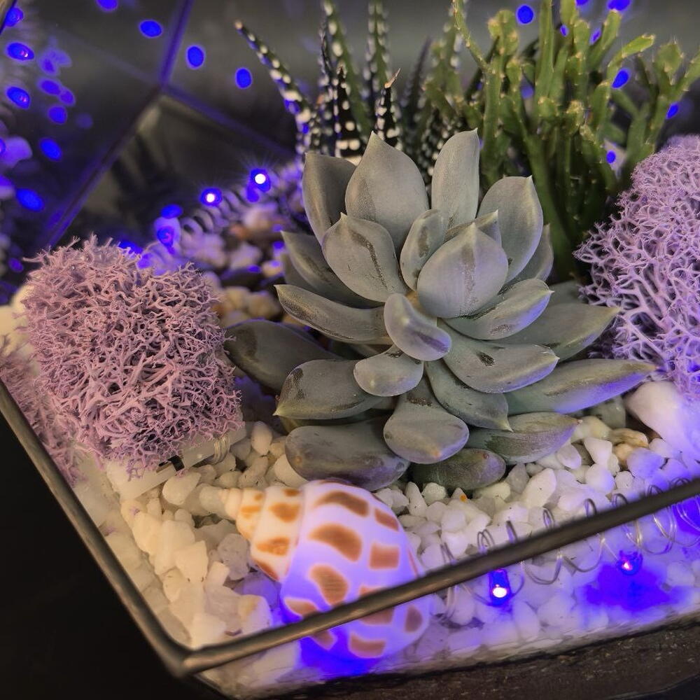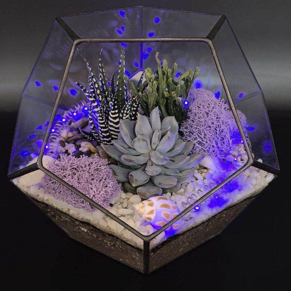 Этот зелёный мирок с живыми суккулентами и нежной гирляндой — настоящее украшение интерьера. Компактный флорариум прекрасно впишется в современный минимализм, скандинавский стиль, лофт или уютную классику. Он не требует сложного ухода и частого полива, поэтому станет радостью даже для тех, кто редко бывает дома или часто уезжает в командировки. 💡 Вечером гирлянда с мягким лавандовым свечением создаёт чарующую атмосферу тепла и спокойствия. Достаточно нажать кнопку — и ваш интерьер заиграет новыми красками. 🎁 Флорариум станет прекрасным подарком: ✔️Любимой девушке или жене — как знак заботы и внимания ✔️Маме, папе, бабушке — чтобы порадовать теплом и уютом ✔️Мужчине, друзьям, коллеге или учителю — стильный и универсальный вариант без лишней романтики 🌸 Поводы для подарка: ✔️ на Татьянин день или День студента ✔️ День рождения ✔️ Домашнее новоселье ✔️ Годовщина свадьбы ✔️ Благодарность коллеге, учителю или наставнику ✔️ Просто, чтобы сказать «Спасибо» или поднять настроение ✔️ 23 февраля ✔️ 8 Марта 🏡 Где разместить: Флорариум гармонично смотрится на журнальном или прикроватном столике, на подоконнике, полке, рабочем столе или ресепшене. Он одинаково уместен в гостиной, спальне, кабинете, салоне красоты или уютном кафе. Этот очаровательный флорариум подарит ощущение гармонии и тепла, наполняя пространство мягким светом и живой энергией природы.