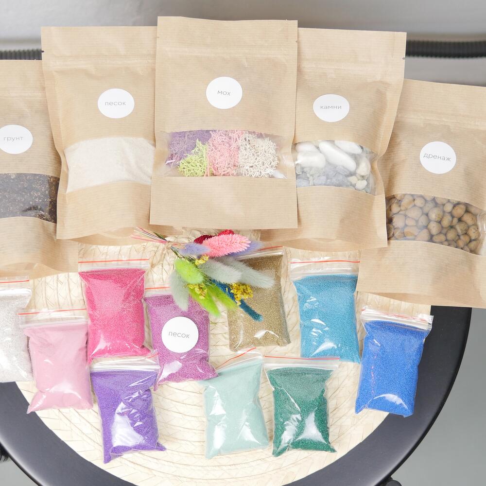 Набор включает в себя все необходимое: геометрическая стеклянная ваза дренаж (керамзит мелкой фракции) профессиональный грунт для суккулентов натуральный песок микс камней цветной песок 10 цветов микс стабилизированного мха (разные цвета) микс сухоцветов (разные цвета и форма) микс суккулентов (разные виды) видео мастер класс по посадке инструкция по уходу перчатки При доставке транспортной компанией в другие города России набор упаковывается в транспортировочную упаковку. Все наши наборы за последние несколько лет работы доставляются в целости и сохранности в другие города России.