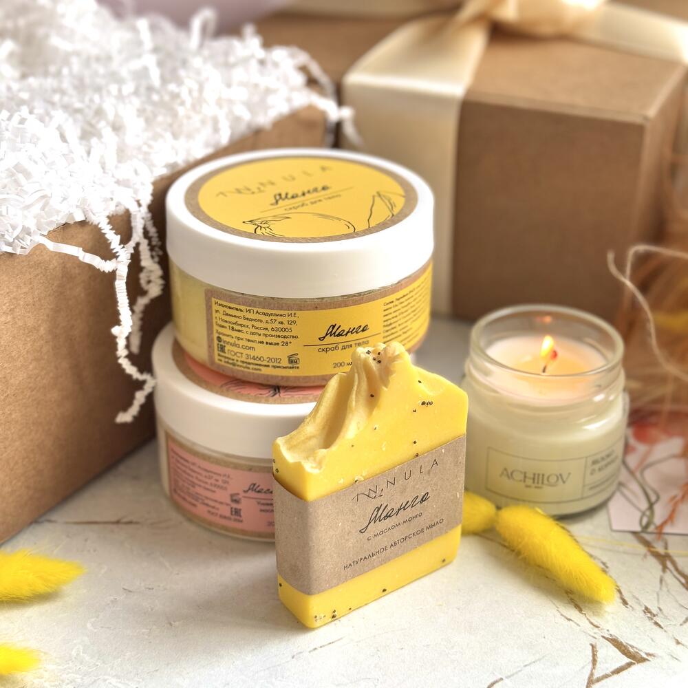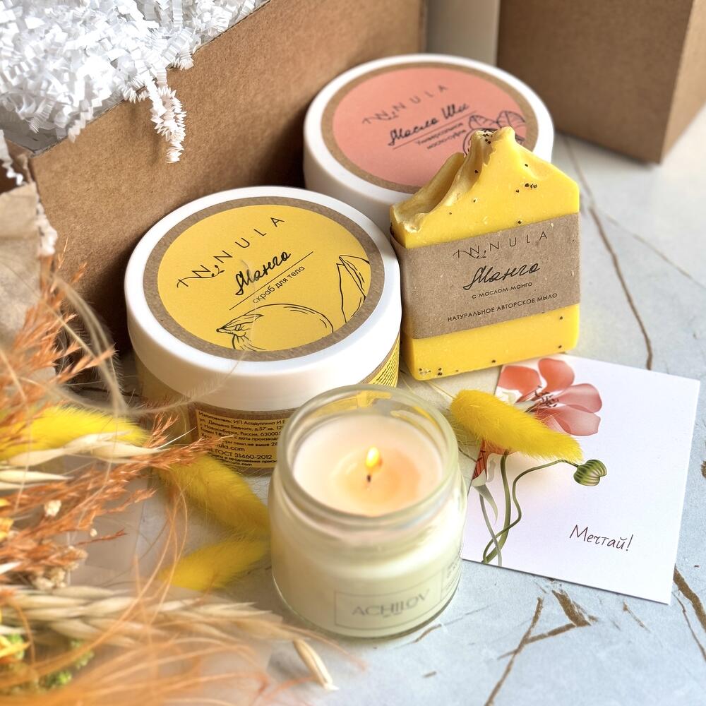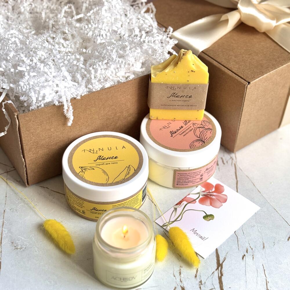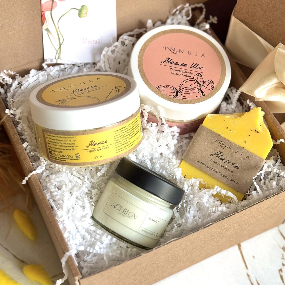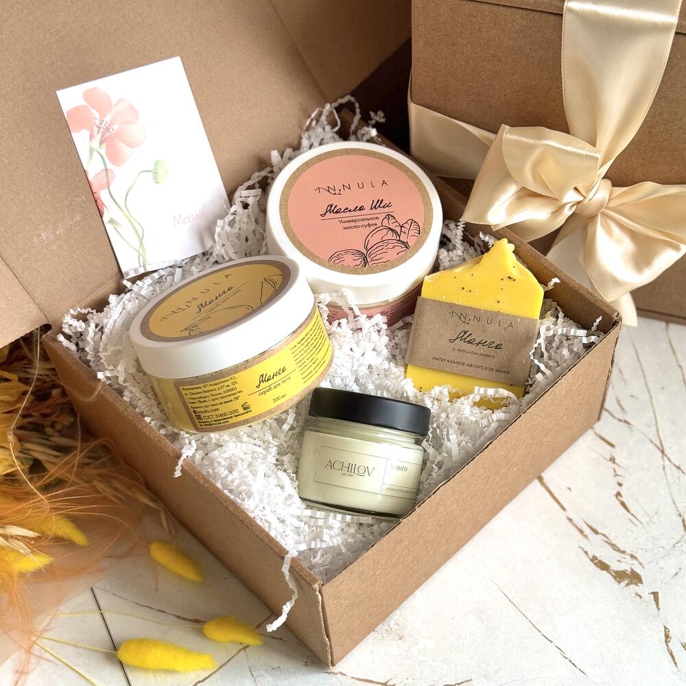 Подарите себе и своим близким кусочек тропического рая с нашим набором косметики «Mango SPA». Этот набор включает в себя продукты с яркими и сочными ароматами манго, которые создадут вам позитивную атмосферу и обеспечат роскошный уход за телом: ✧ Сахарный скраб для тела Манго, INNULA: деликатно отшелушивает омертвевшие клетки кожи, делая ее мягкой и гладкой. Аромат манго подарит воспоминания о райских островах и хорошее настроение. 100 % натуральный состав. ✧ Натуральное мыло Манго с маслом манго, INNULA: заботливо очищает кожу без возникновения чувства сухости. Запах мыла напомнит вам мякоть настоящего фрукта, яркую, сладкую и истекающую соком. ✧ Универсальное масло-суфле Масло Ши, INNULA: увлажняет и питает кожу, делая ее эластичной и бархатистой. Идеально подходит для сухой и чувствительной кожи. Может использоваться не только как крем для тела, но и как бальзам для губ, маска для волос, масло после загара, крем после бритья, масло для ухода за ногтями. ✧ Ароматическая свеча «Манго», ACHILOV: создает уютную и расслабляющую атмосферу. Аромат манго наполнит помещение сладостью и экзотикой. Время горения свечи: 12 часов. Рекомендуем отдельно приобрести открытку, на которой вы можете написать теплые слова любви и заботы, чтобы сделать ваш подарок еще более особенным. Вы могли искать: подарок на день матери, в подарок, ко дню матери, бьюти-бокс, что подарить, подарок женщине, подарок маме, подарок матери, подарочный набор, подарок девушке, женский подарок, подарок любимой, подарок жене, красивый подарок, подарки на праздники, повышение по службе, подарок врачу, подарок директору, корпоративные подарки, подарок няне, подарок для девочки, подарок воспитателю, подарочный бокс.