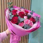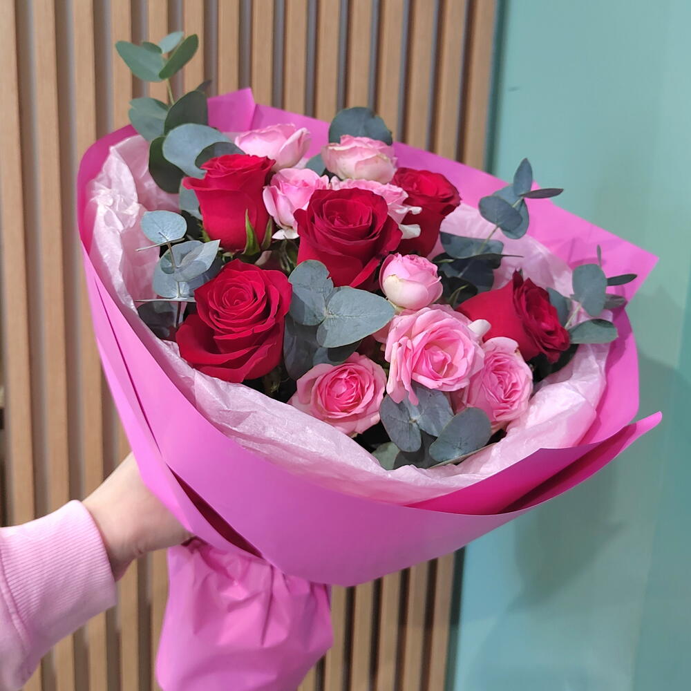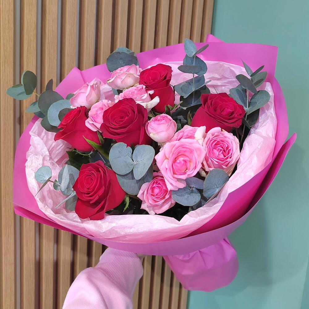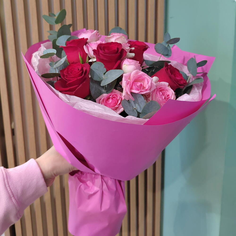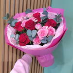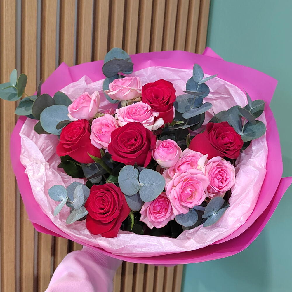Розы красные, кустовые розы, эвкалипт букетик на 8 марта