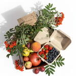 Гранат - 1 шт. Сочная клубника - 400 гр. спелые сливы - 600 гр. сладкий виноград - 500 гр. хрустящие яблоки - 600 гр. медовая хурма - 600 гр. ароматная голубика - 400 гр. нежная груша - 600 гр. веточка рябины (сухоцветы) - 1 шт.
