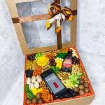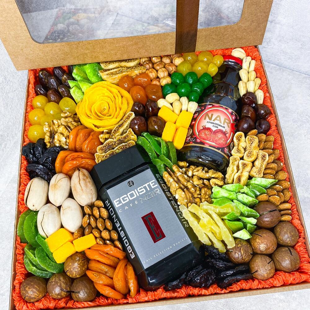 Ананас - 40 гр. Киви - 130 гр. Коробка - 1 шт. Грецкий орех - 40 гр. Финик - 60 гр. Помело - 130 гр. Кешью - 20 гр. Инжир - 95 гр. Сок гранатовый - 310 мл Миндаль - 35 гр. Кумкват - 160 гр. Фундук - 30 гр. Курага - 150 гр. Чернослив - 105 гр. Манго сушеный - 80 гр. пекан - 50 гр. макадамия - 90 гр. манго кубики - 60 гр. кофе молотый эгоист - 100 гр. финик иран - 75 гр.