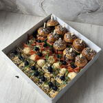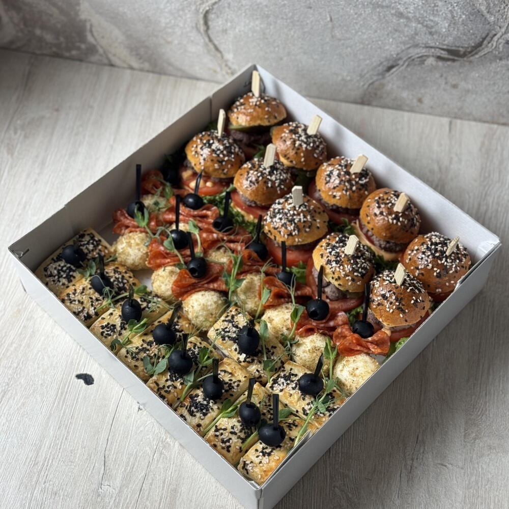 Состав бокса: - мини-бургеры 10шт - клаб канапе с грудинкой - 10шт - чизбол с сальчичоном - 10шт