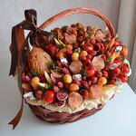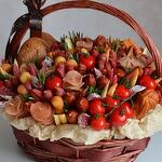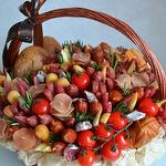 Корзина плетеная - 1 шт. Наполнитель - 3 шт. Колбаса - 250 гр. Колбаса сырокопченая - 100 гр. Колбаски охотничьи - 100 гр. колбаски копченые - 150 гр. черри помидоры - 125 гр. чиабатта - 2 шт. розмарин пучок - 1 шт. сыр сырокопченный - 100 гр.