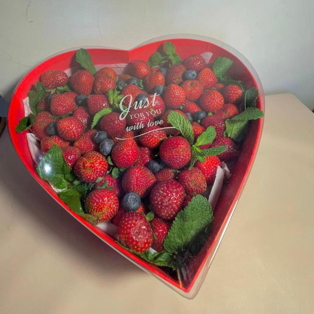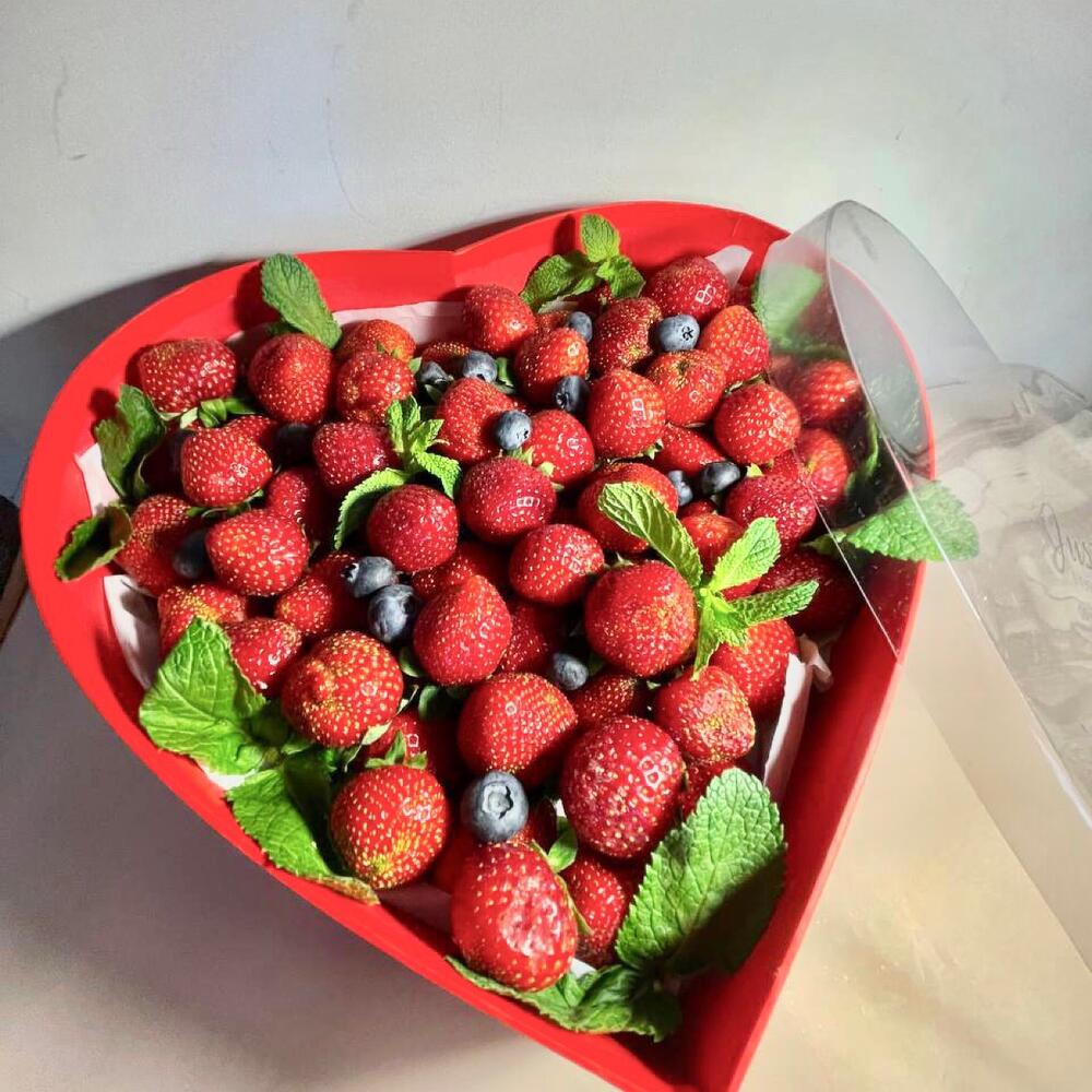 Ароматная сладкая клубника, голубика и мята в коробке в форме сердца размер 28’26’7