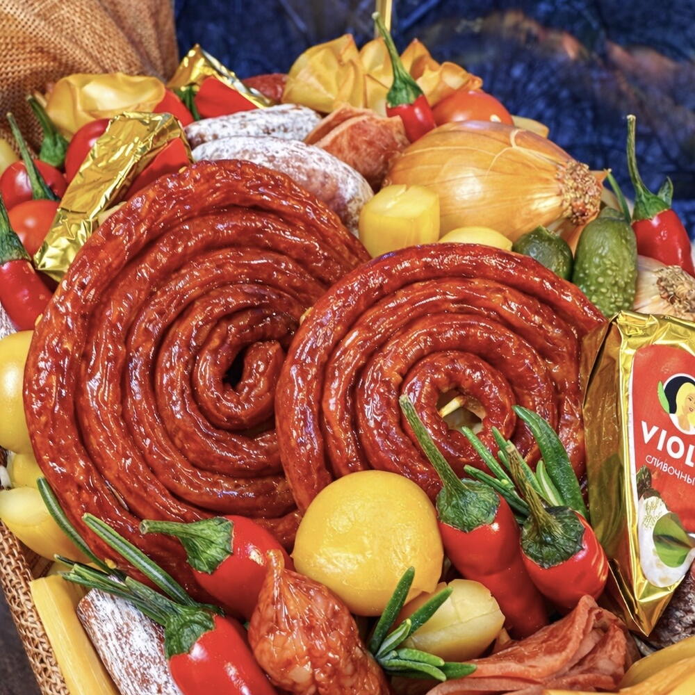 Амбициозная эффектная композиция из колбасы, сыров и овощей в форме конфеты. Конфета произведет фурор, вы только задумайтесь - КОНФЕТА ИЗ КОЛбАСЫ, такой подарок точно запомнят !