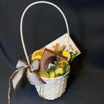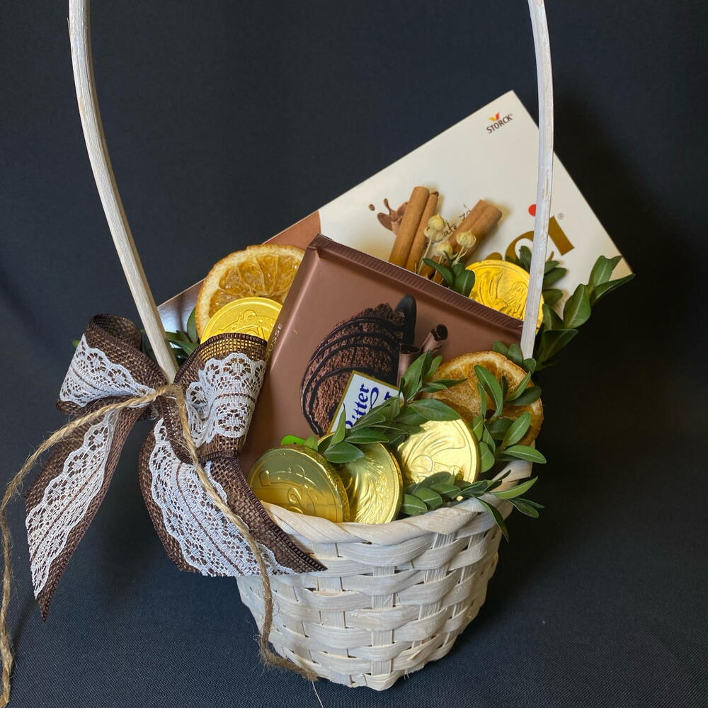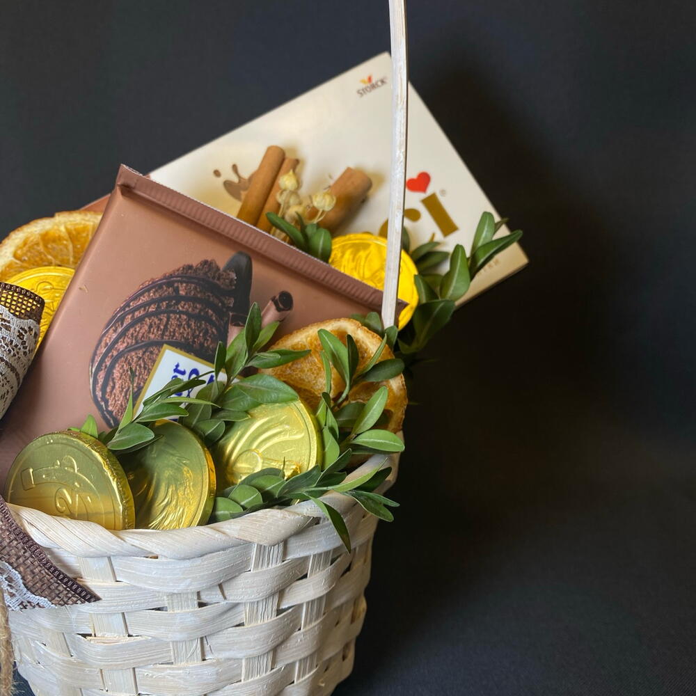 Корица - 2 шт. Тишью - 1 шт. Самшит - 1 шт. Корзина плетеная - 1 шт. Риттер спорт - 1 шт. апельсиновые дольки - 2 шт. мерси шоколад 100г - 1 шт. монетки шоколадные - 5 шт.