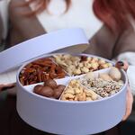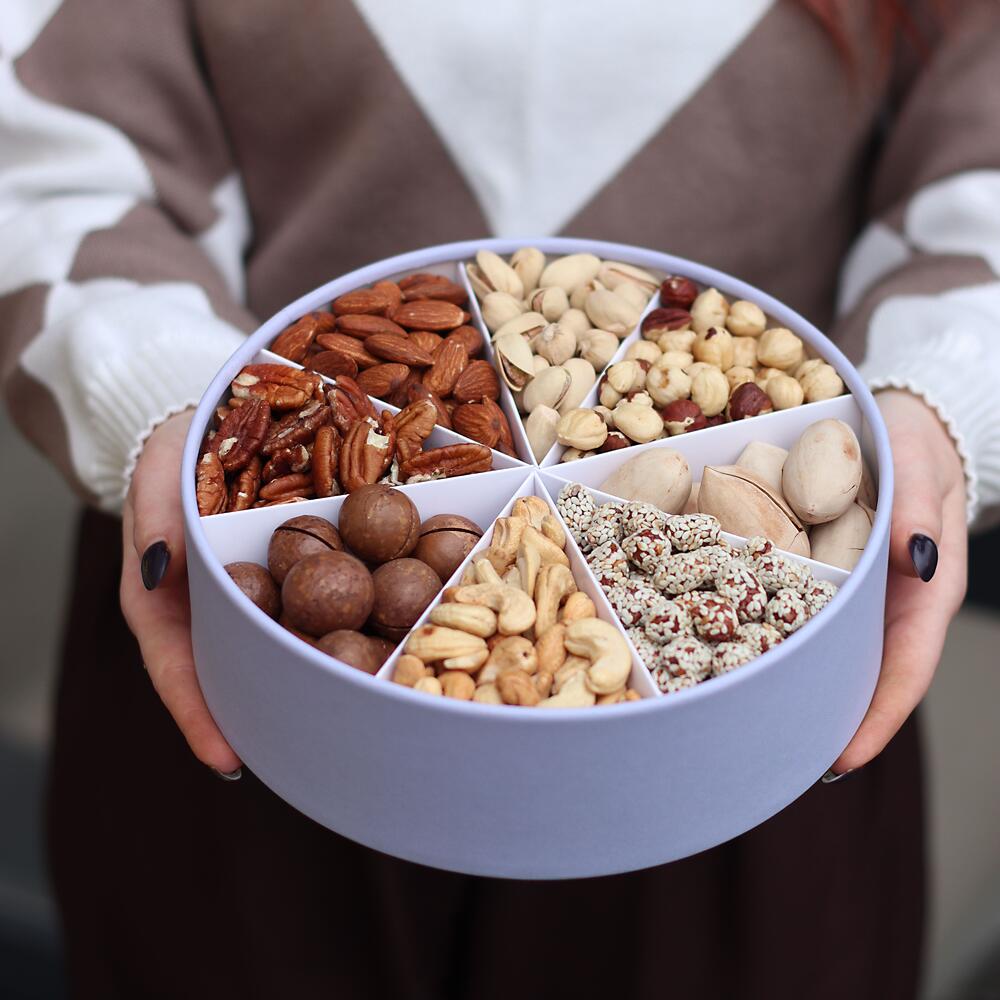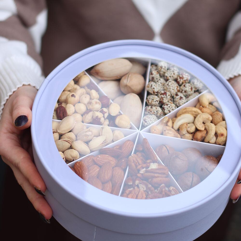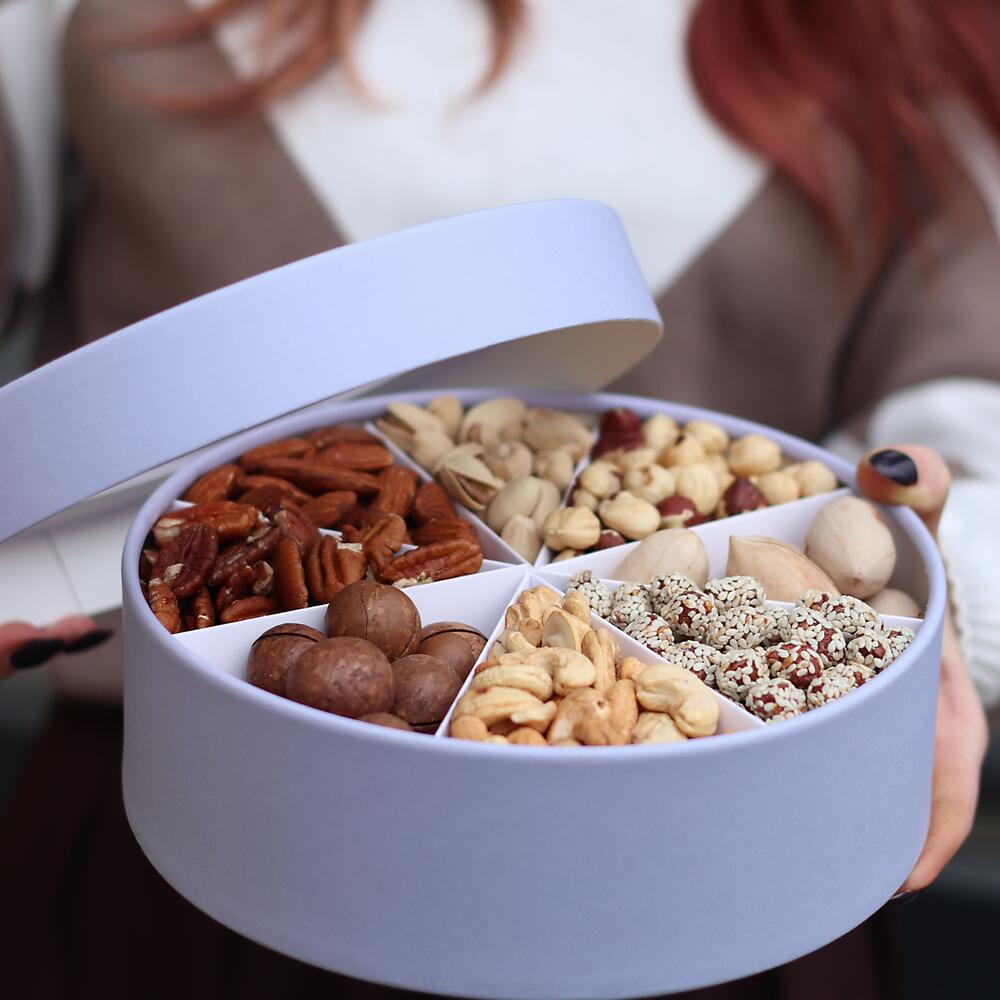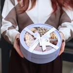 Подарочный набор орехов в круглой коробке. Вкусно и полезно. Вес нетто - 1000 (граммовка по отдельным видам ореха )