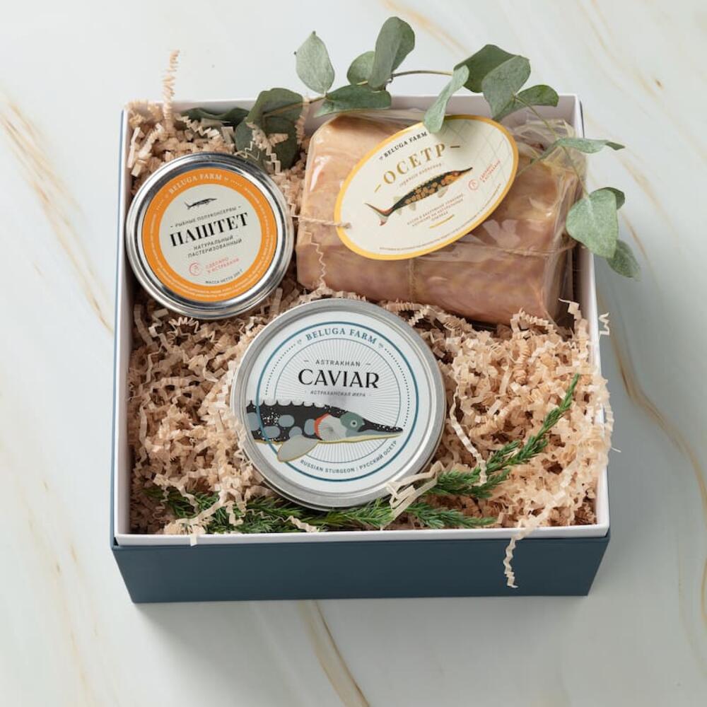 астраханский деликатес - 1 шт. икра русского осетра традиционная 125 г - 1 шт. подарочный короб с логотипом - 1 шт. - 1 шт. осетр горячего копчения 500 г - 1 шт. подарочный короб + подарочный пакет - 1 шт.
