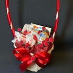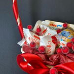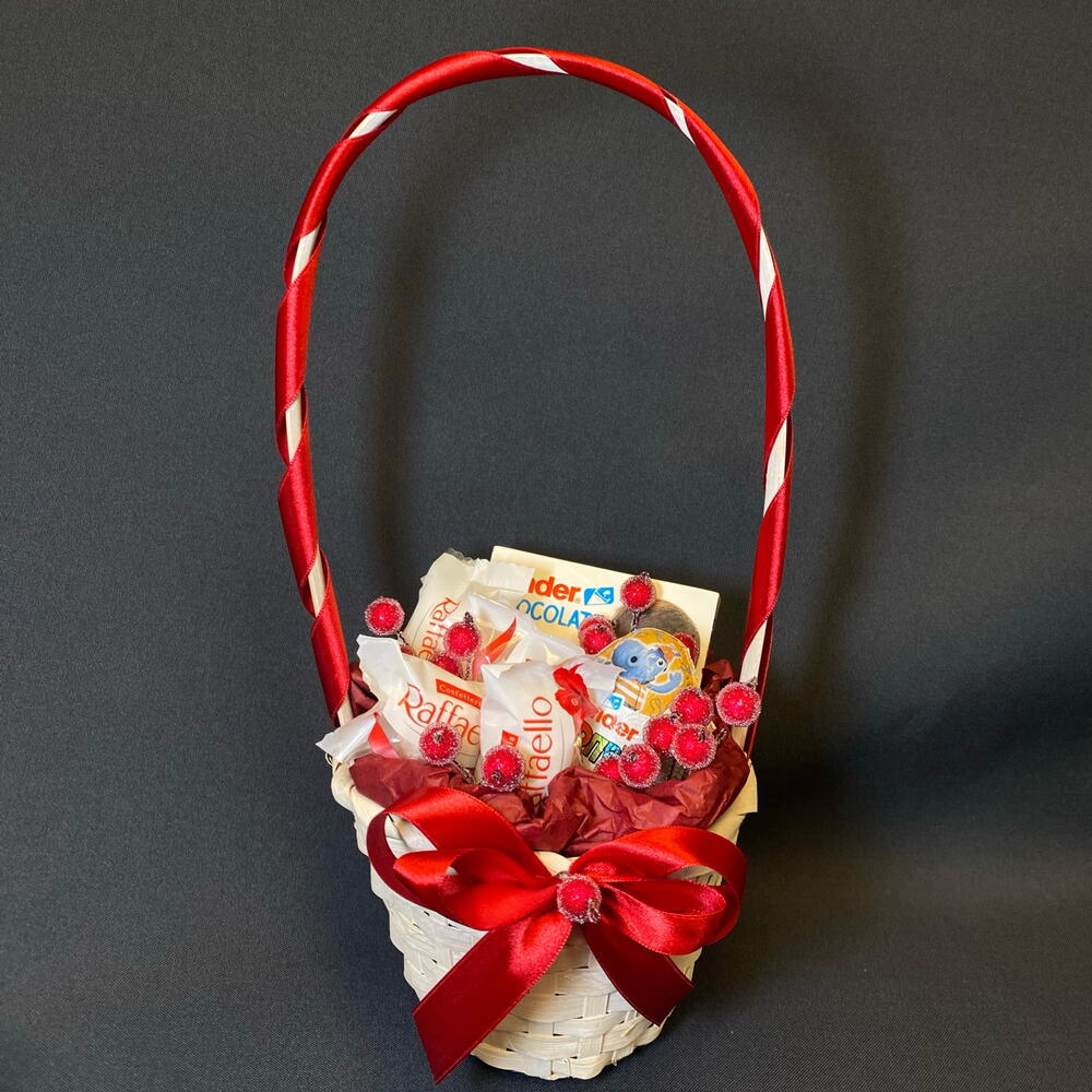 Раффаэлло - 4 шт. Киндер сюрприз - 1 шт. Корзина плетеная - 1 шт. Киндер шоколад - 1 шт. ягоды декоративные связка - 1 шт.