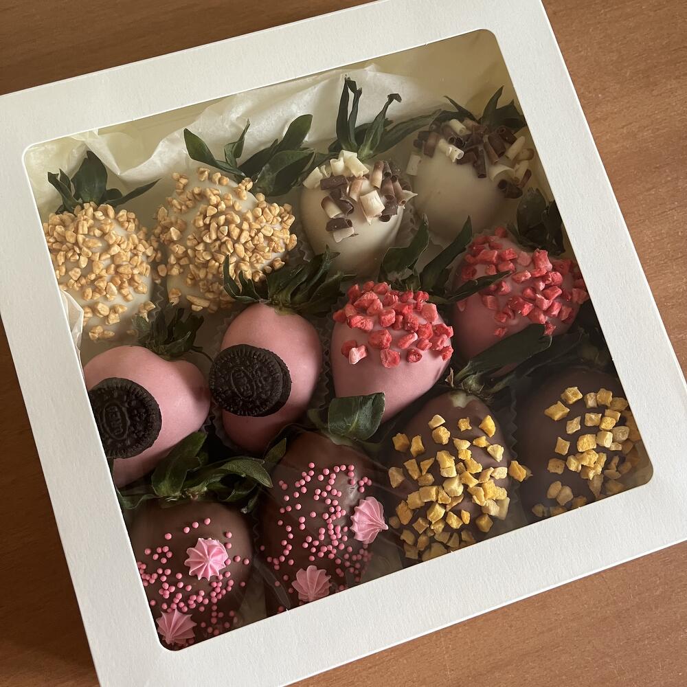 Отборная клубника, премиальный бельгийский шоколад Callebaut, шоколадные завитки, карамелизированный рис, сублимированная клубника, сублимированное манго, мини-безе, печенье Oreo-мини, кондитерская посыпка. Шоколад Callebaut Белый 25,9 % (Бельгия): сахар, масло какао, сухое цельное молоко, эмульгатор: соевый лецитин, натуральный ароматизатор: ваниль. Шоколад Callebaut Молочный 33,6% (Бельгия): сахар, масло какао, сухое цельное молоко, какао тертое, эмульгатор: соевый лецитин, натуральный ароматизатор: ваниль. Шоколад Callebaut Розовый со вкусом клубники (Бельгия): сахар, масло какао, сухое цельное молоко, эмульгатор: соевый лецитин, краситель Е120 (кармин) - натуральный красный краситель, натуральный ароматизатор: ваниль.