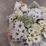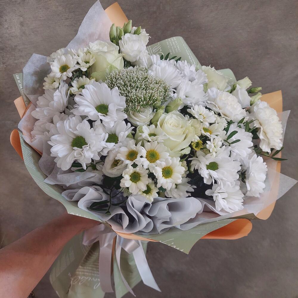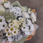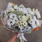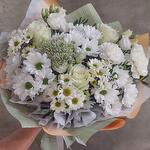 "БЕЛЫЙ ИНЕЙ" Белоснежный букет с ромашковой хризантемой, розами, диантусами и эустомой