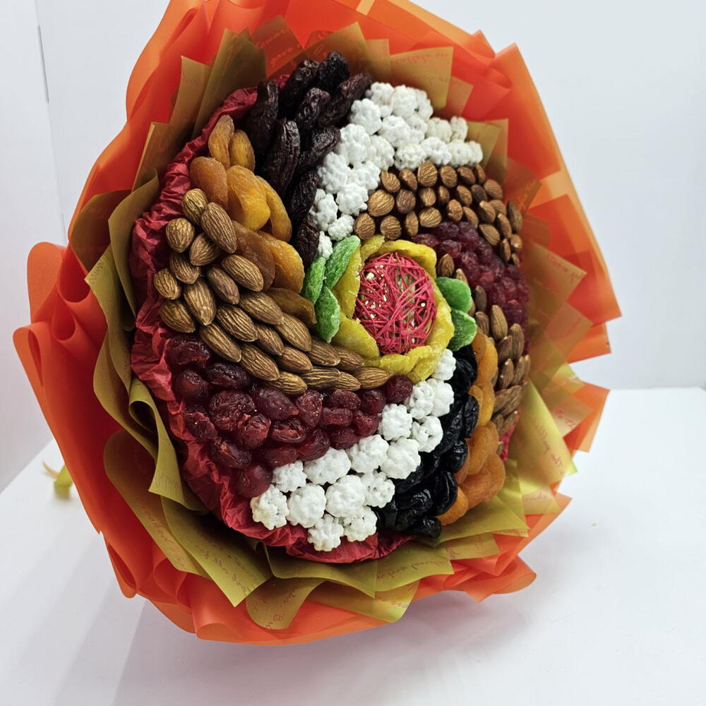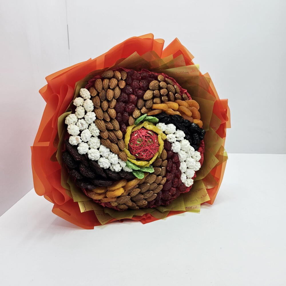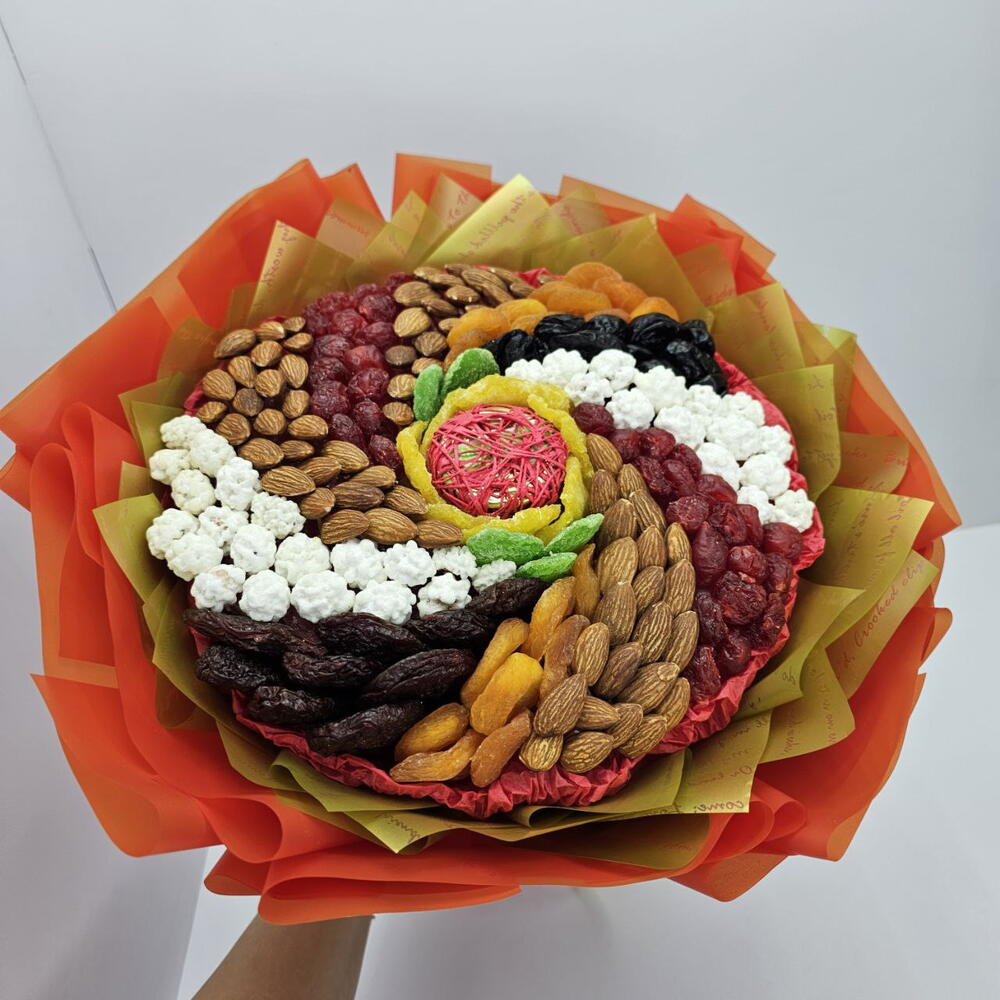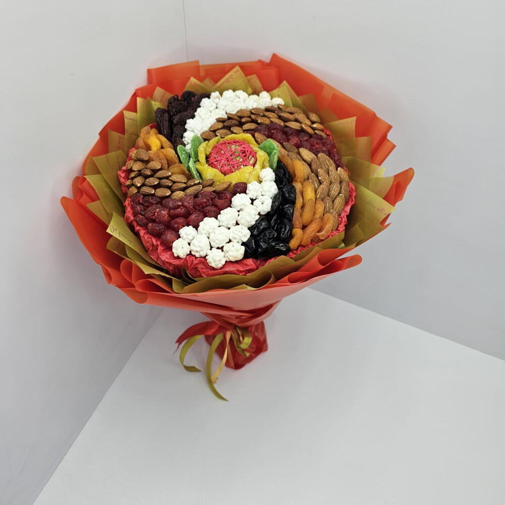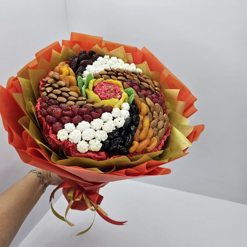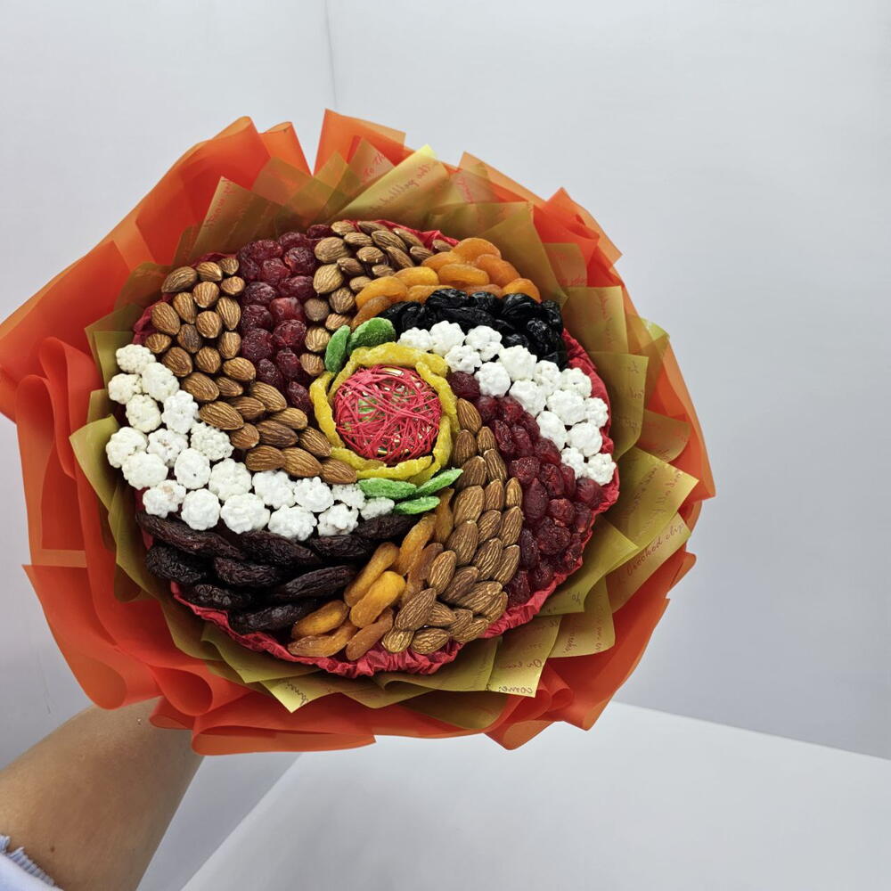 Букет из сухофруктов и орехов Вихрь с медом — это съедобная композиция, которая включает в себя разнообразие натуральных ингредиентов, таких как: курага, чернослив, ананас, вишню, а также орехи: миндаль и арахис в сахарной глазури. такой букет станет полезным и оригинальным подарком для любого повода, например, для Дня рождения или Нового года, как для мужчин, так и для женщин.