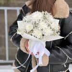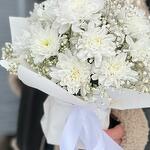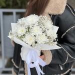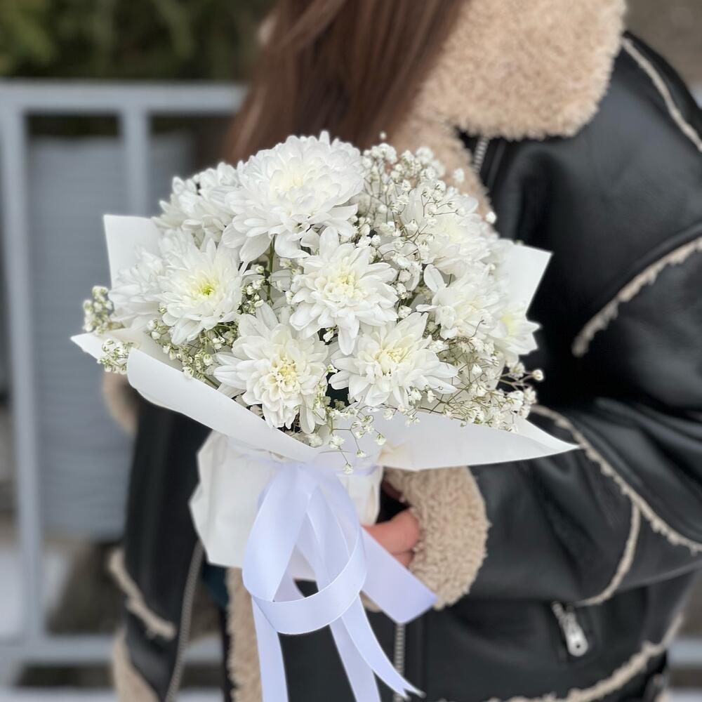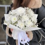 Гіпсофіла - 1 шт. Хризантема Кущова - 2 шт. Стрічка атласна - 2 шт. Упаковка дизайнерська - 2 шт. Оазис флористичний - 1 шт.